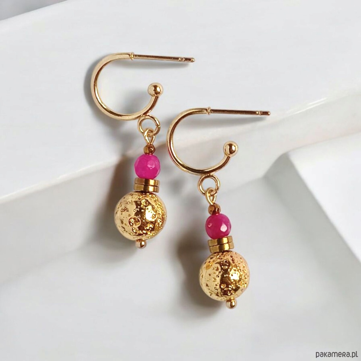 niebanalne kolczyki wykonane ze złotej, porowatej lawy (ok. 8mm) z dodatkiem fasetowanego agatu w kolorze intensywnej fuksji. przekładki wykonane ze złotego hematytu.