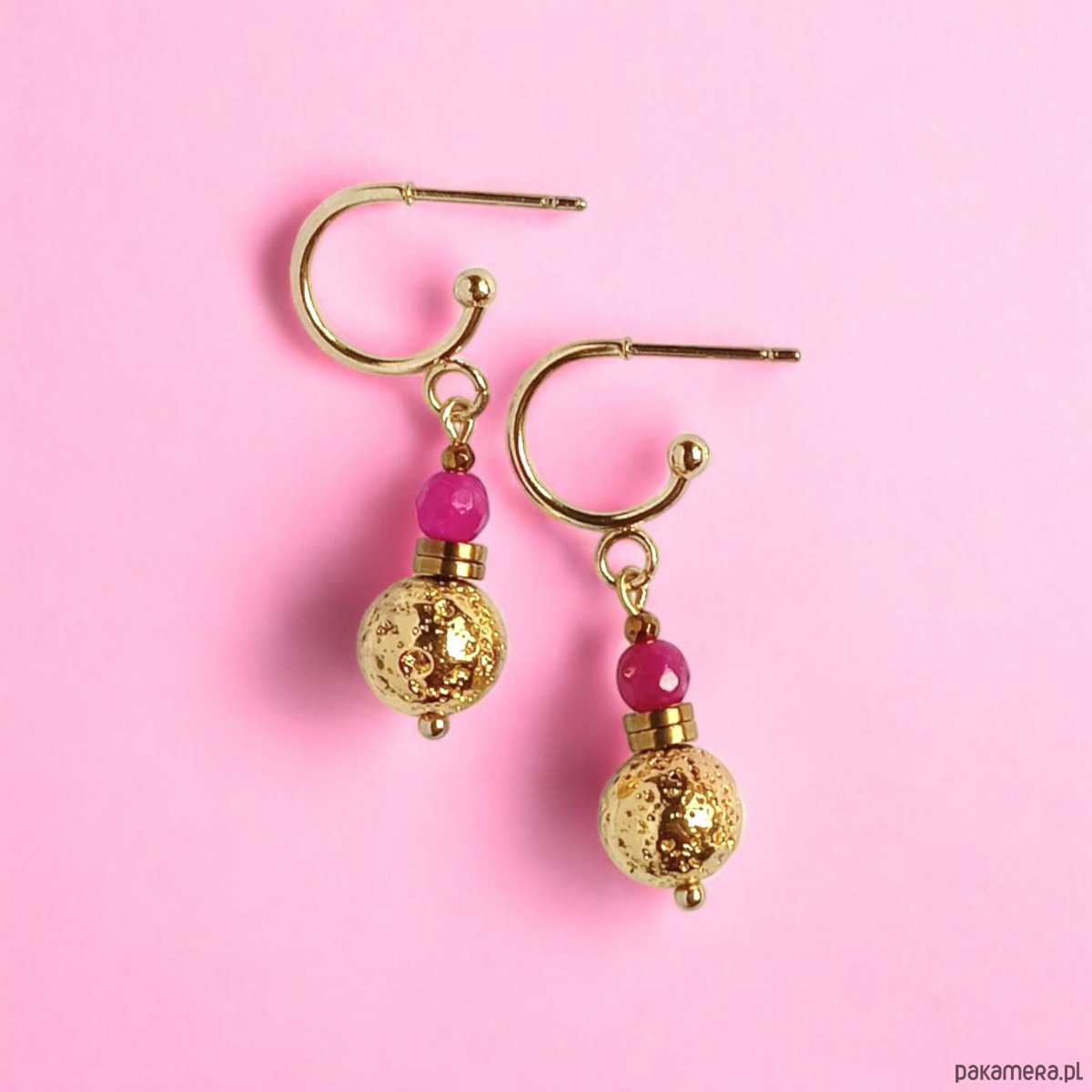 niebanalne kolczyki wykonane ze złotej, porowatej lawy (ok. 8mm) z dodatkiem fasetowanego agatu w kolorze intensywnej fuksji. przekładki wykonane ze złotego hematytu.