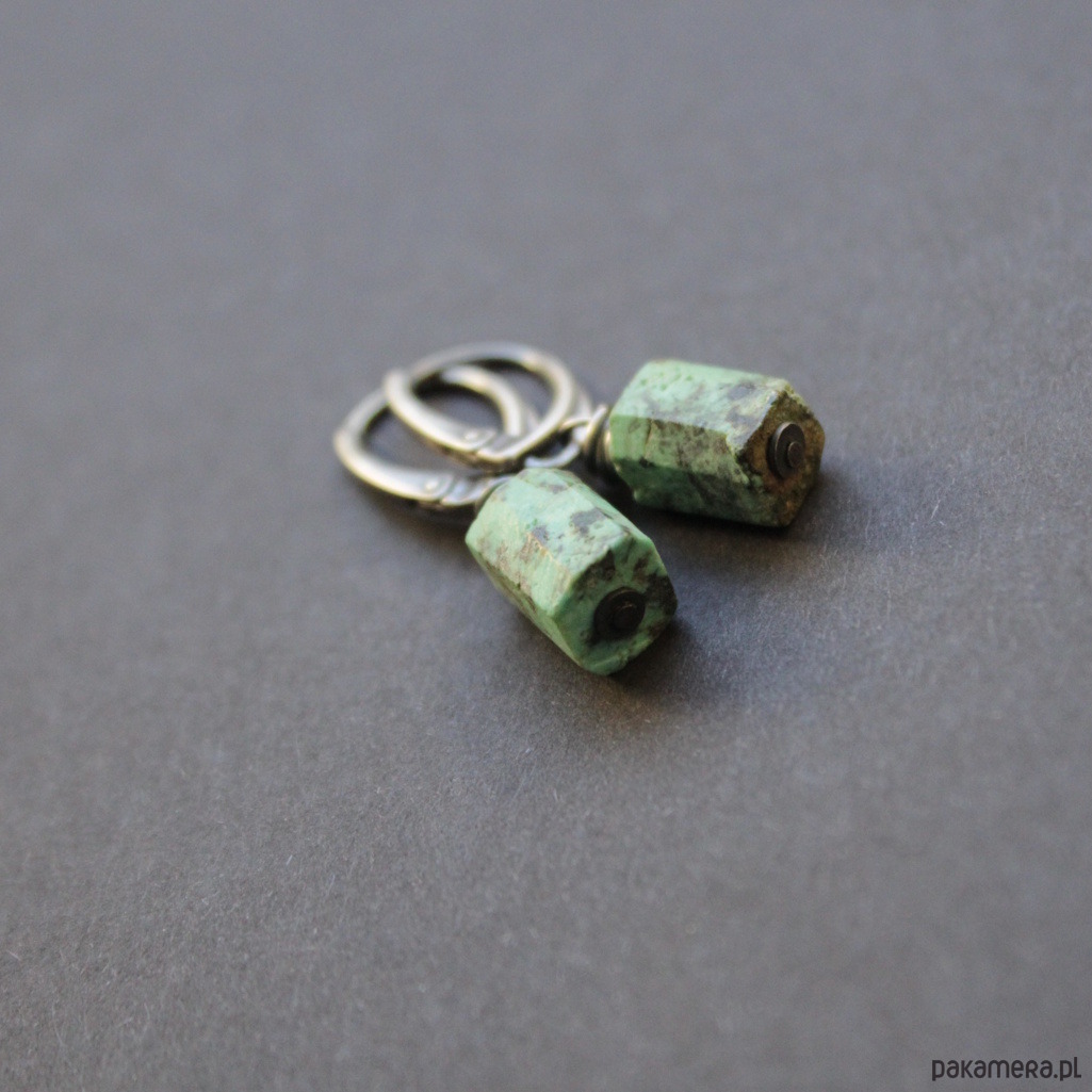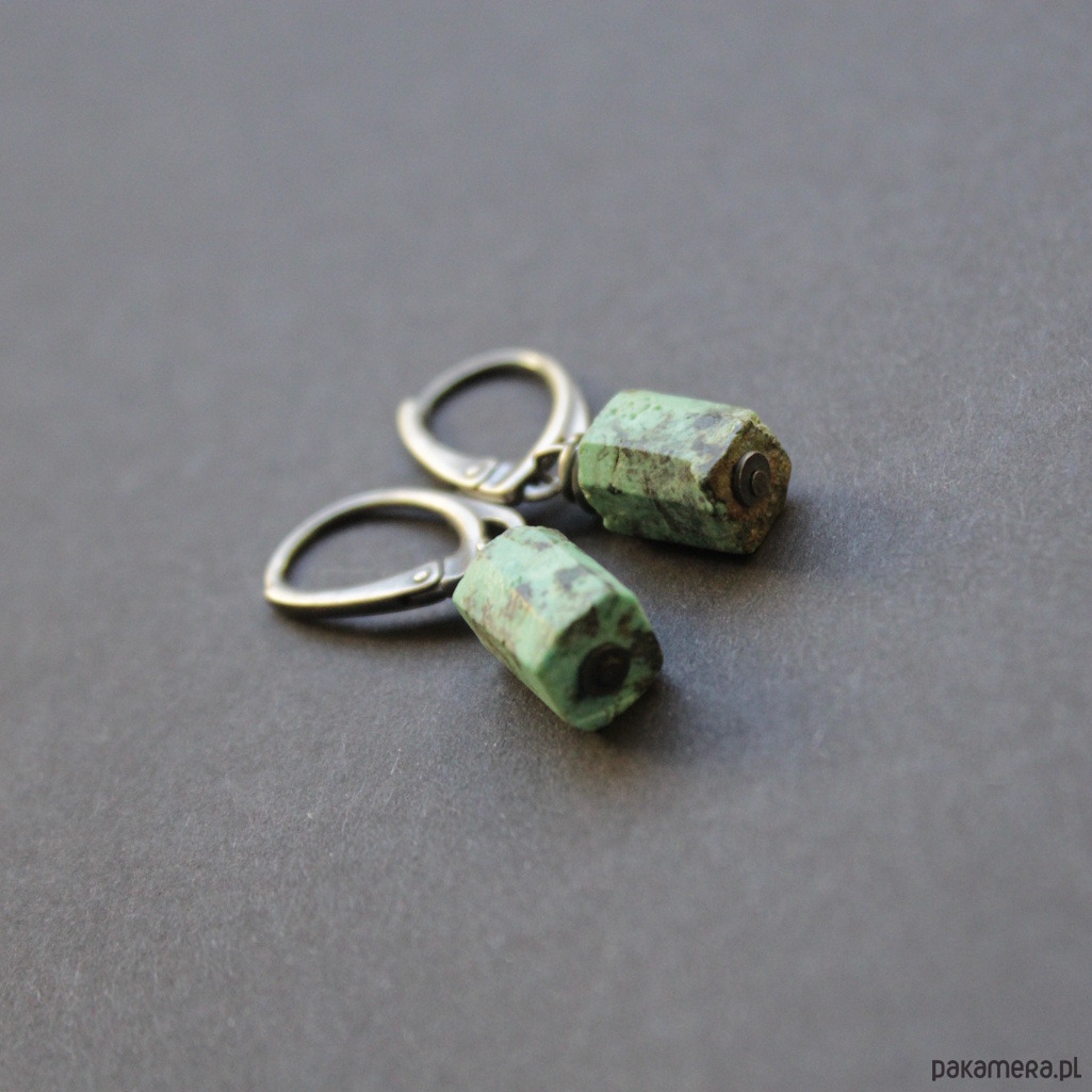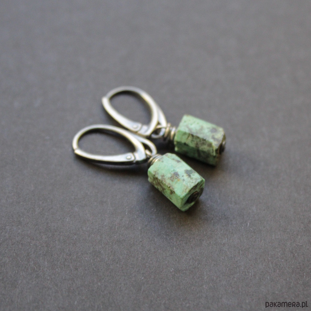 Kolczyki wykonane zostały z oksydowanego srebra próby 925 oraz surowych turkusów afrykańskich wielkości 0,8 cm.
