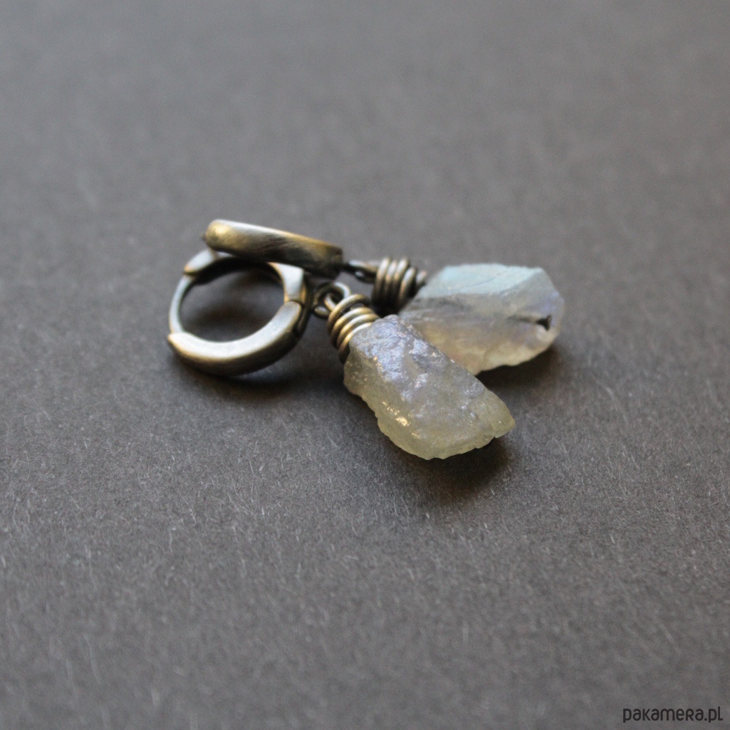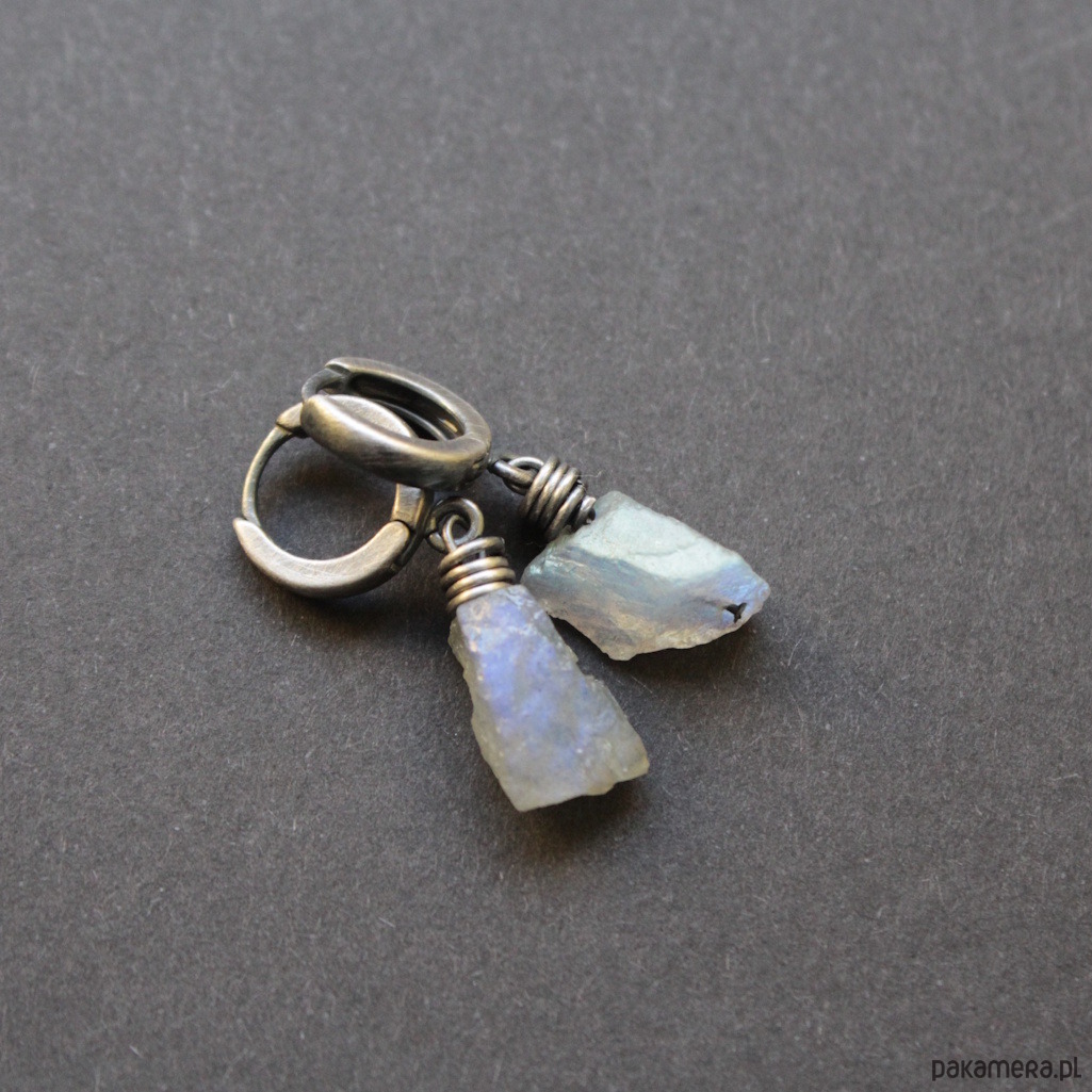 Kolczyki wykonane zostały z oksydowanego srebra próby 925 oraz bryłek pięknego, surowego labradorytu wielkości 0,9-1,1 cm.