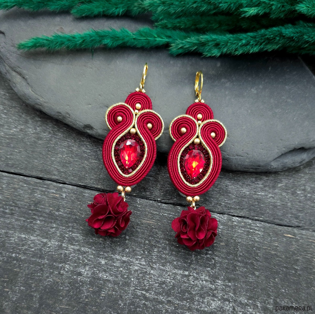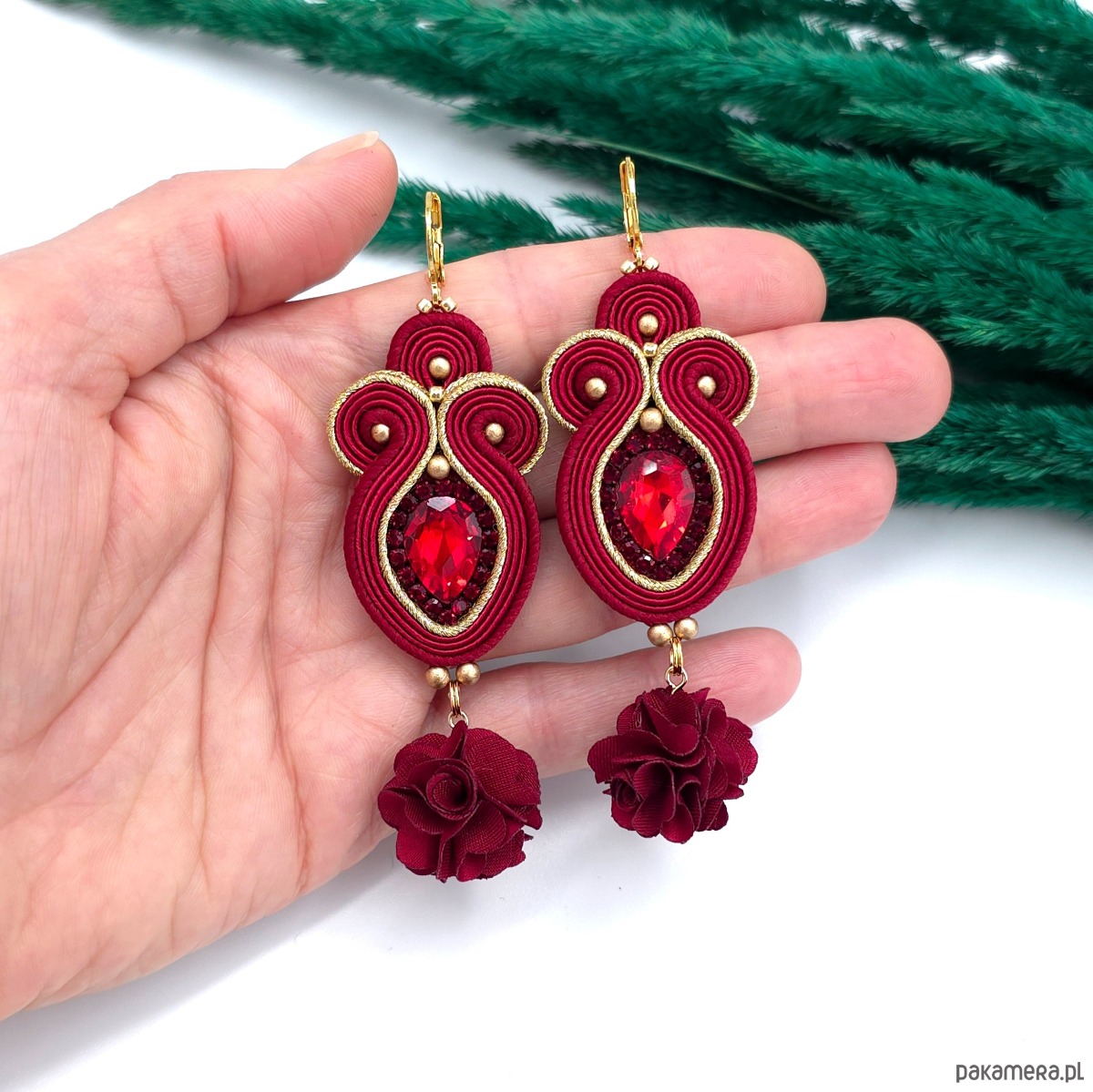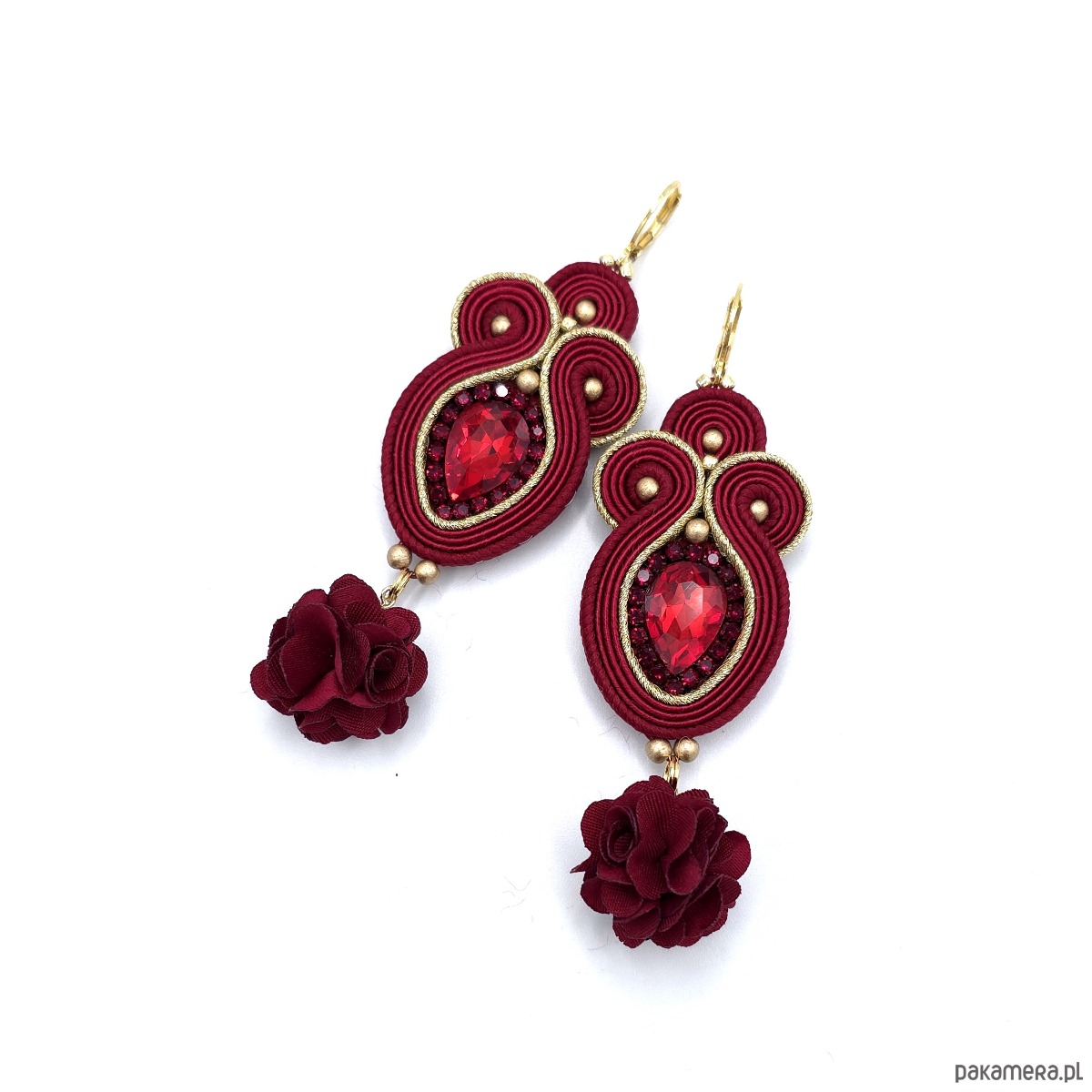 Kolczyki sutasz bordowo czerwone "Rosalia" z kryształkiem i kwiatkiem