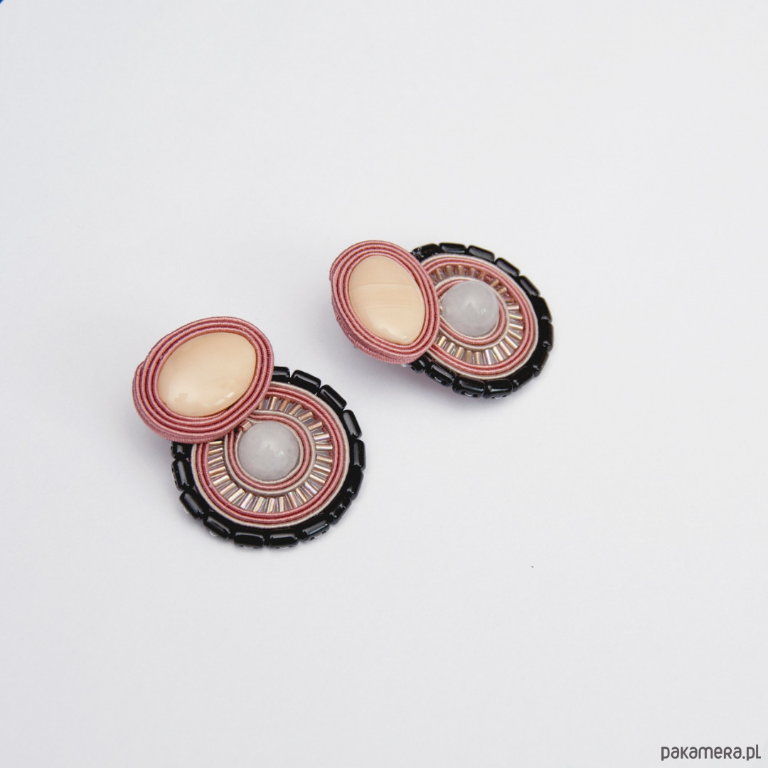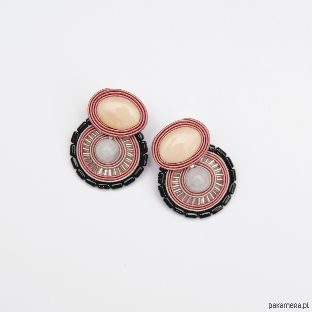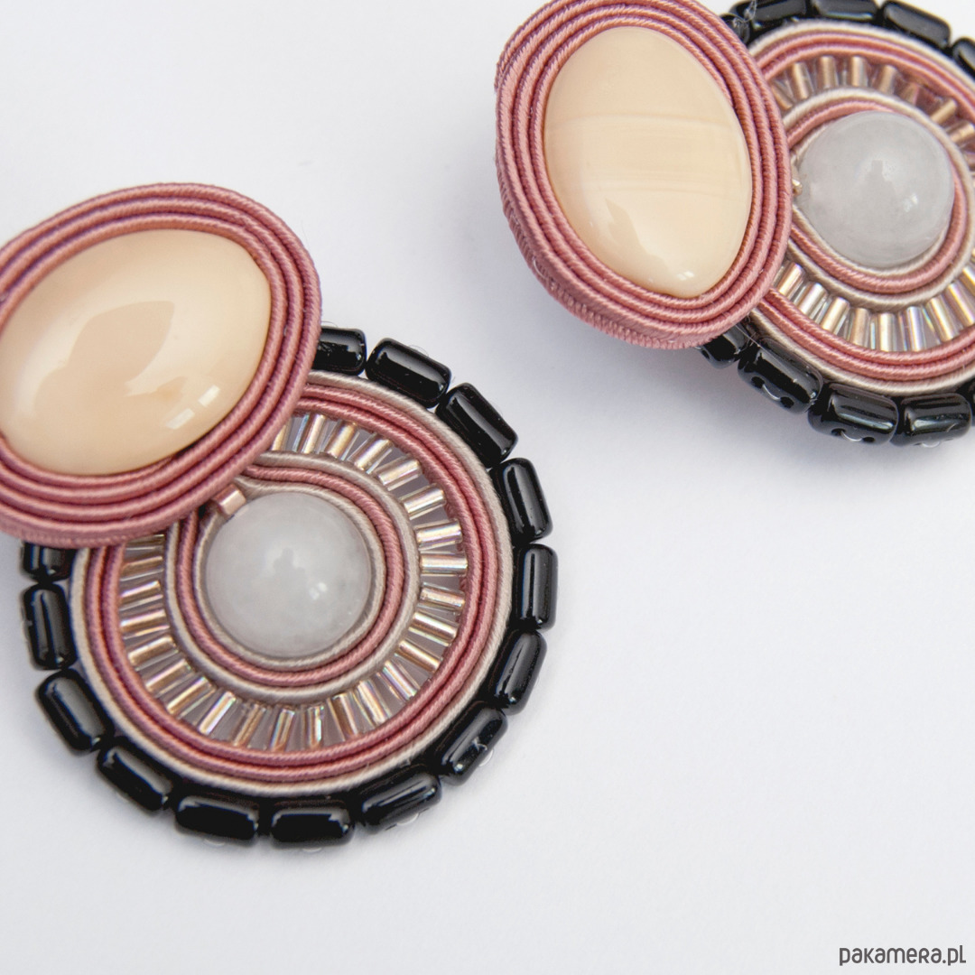 "Kolczyki sutasz brudny róż, beżowe " wykonane są techniką haftu sutasz. Zrobione z kamieni naturalnych (jadeit), szklanych koralików, drobnych koralików, sznurków sutasz i sztyftów ze stali chirurgicznej (antyalergiczna). Tył kolczyków stanowi skóra naturalna. Długość kolczyka to około 4 cm cm, szerokość w najszerszym miejscu wynosi około 3,5 cm.