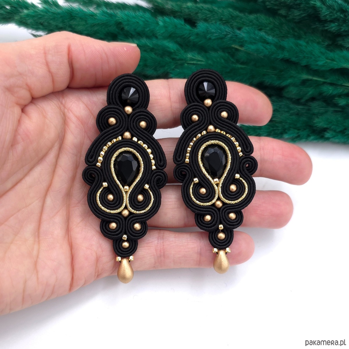 Kolczyki sutasz czarne ze złotem "Olia" wieczorowe długie z kryształkami