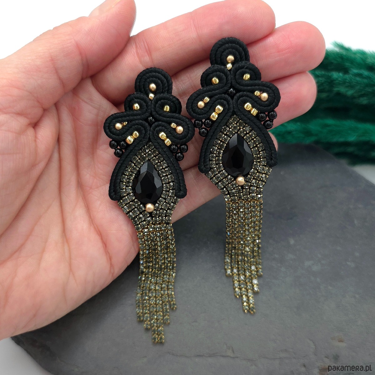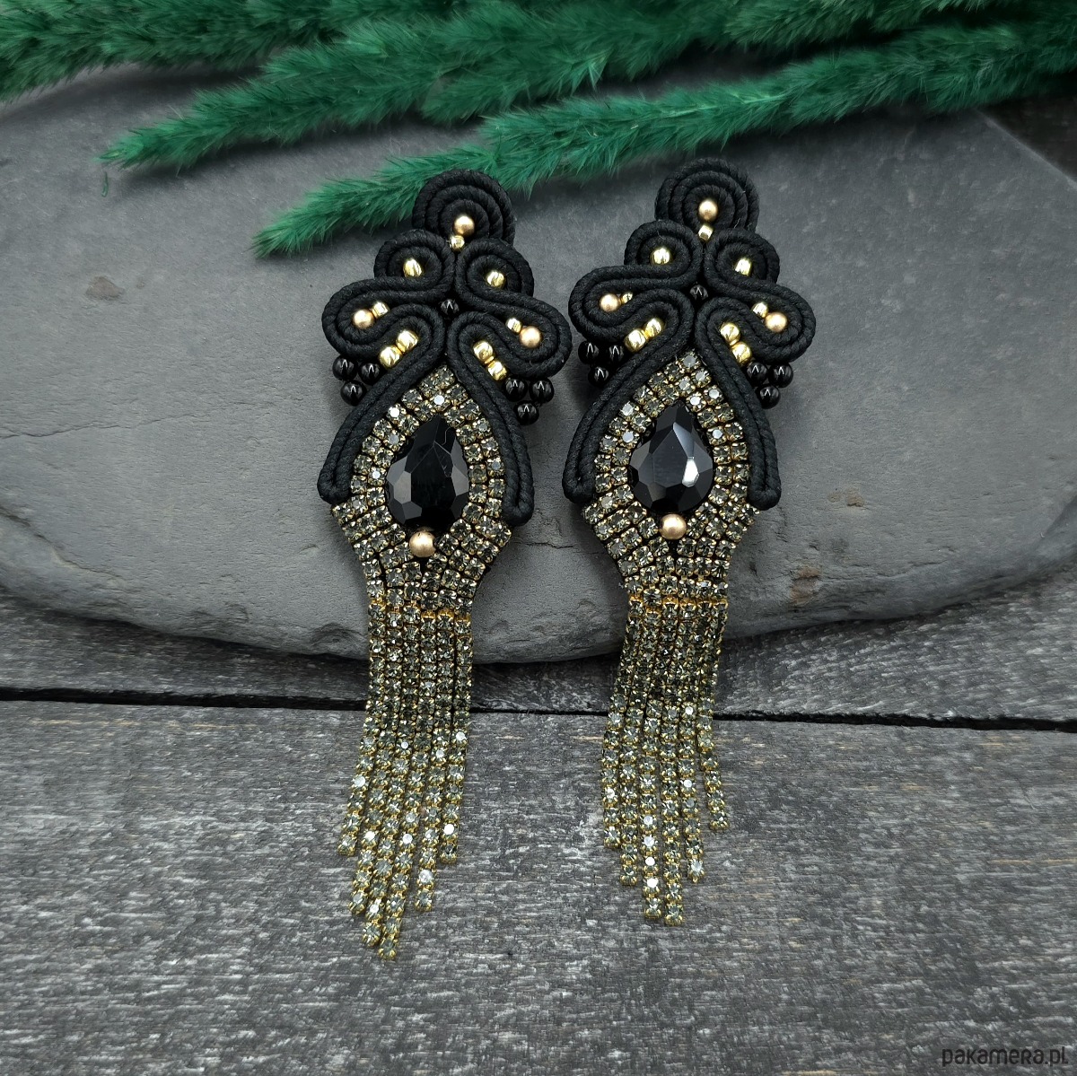 Długie kolczyki sutasz w kolorze czarno-złotym to wyjątkowa propozycja na wieczorowe wyjścia i karnawałowe stylizacje.