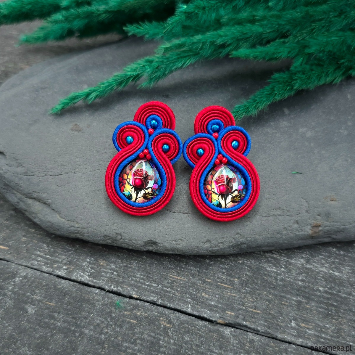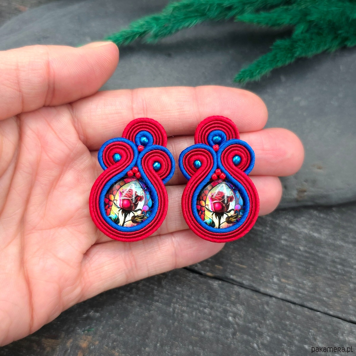 kaboszony z grafiką kwiatów, koraliki Round Beads, koraliki Toho, czeskie i greckie sznurki sutasz, sztyfty ze stali chirurgicznej.