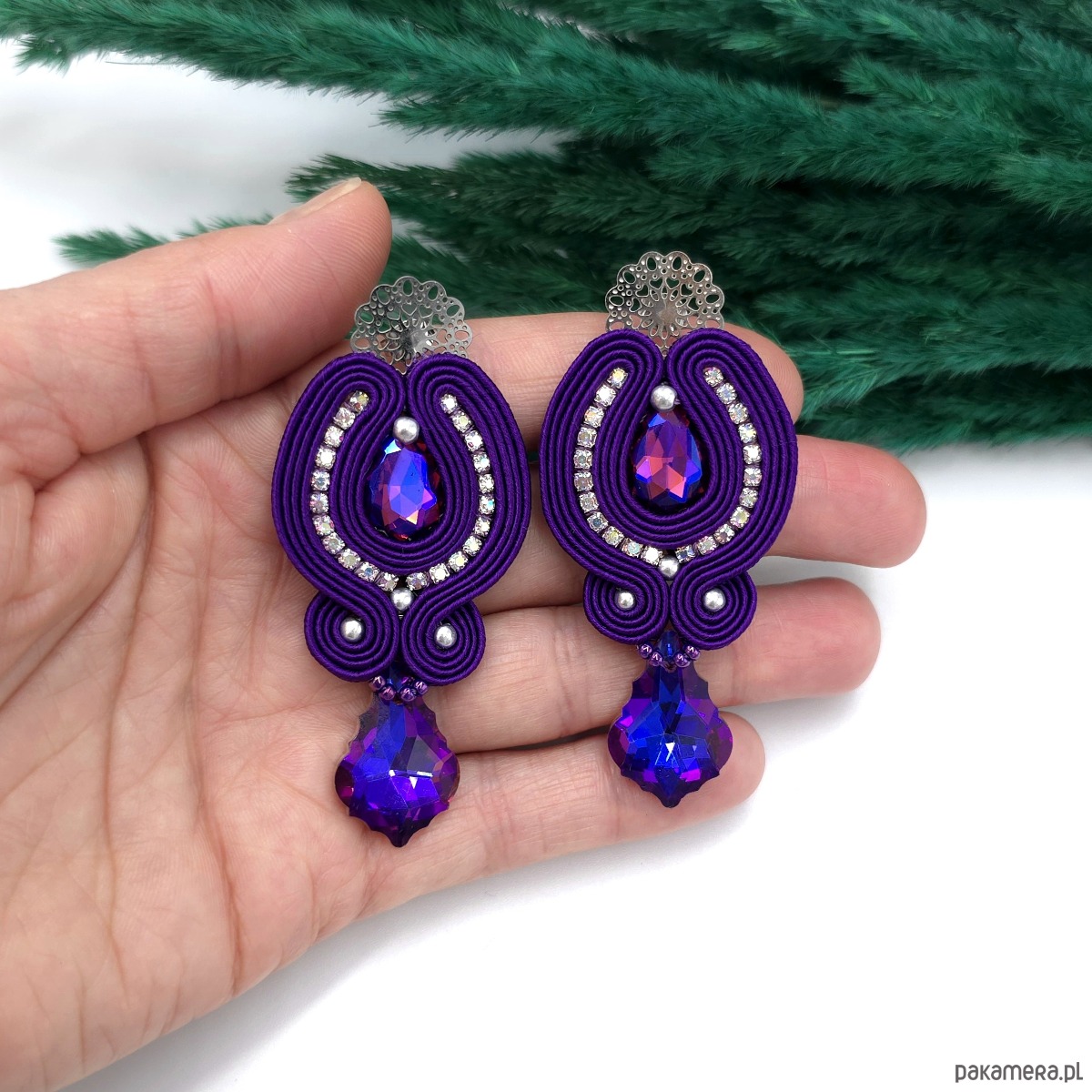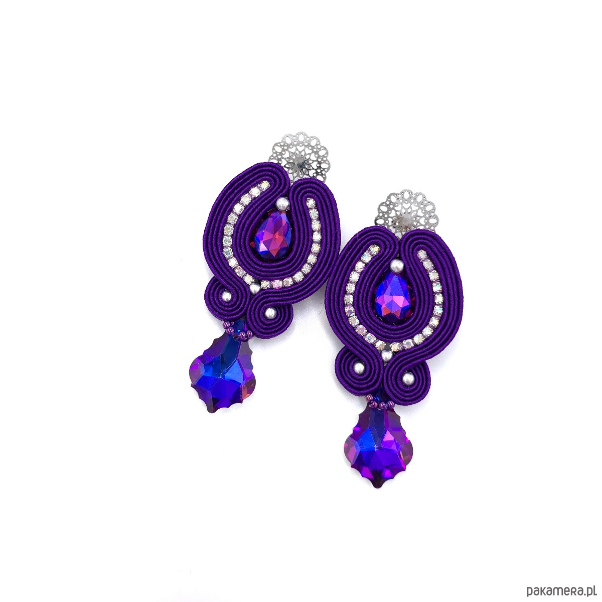 Ręcznie wykonane kolczyki z sutaszu w intensywnym fioletowym kolorze, zachwycają blaskiem kryształków oraz elegancką formą idealną na wieczorne wyjścia.