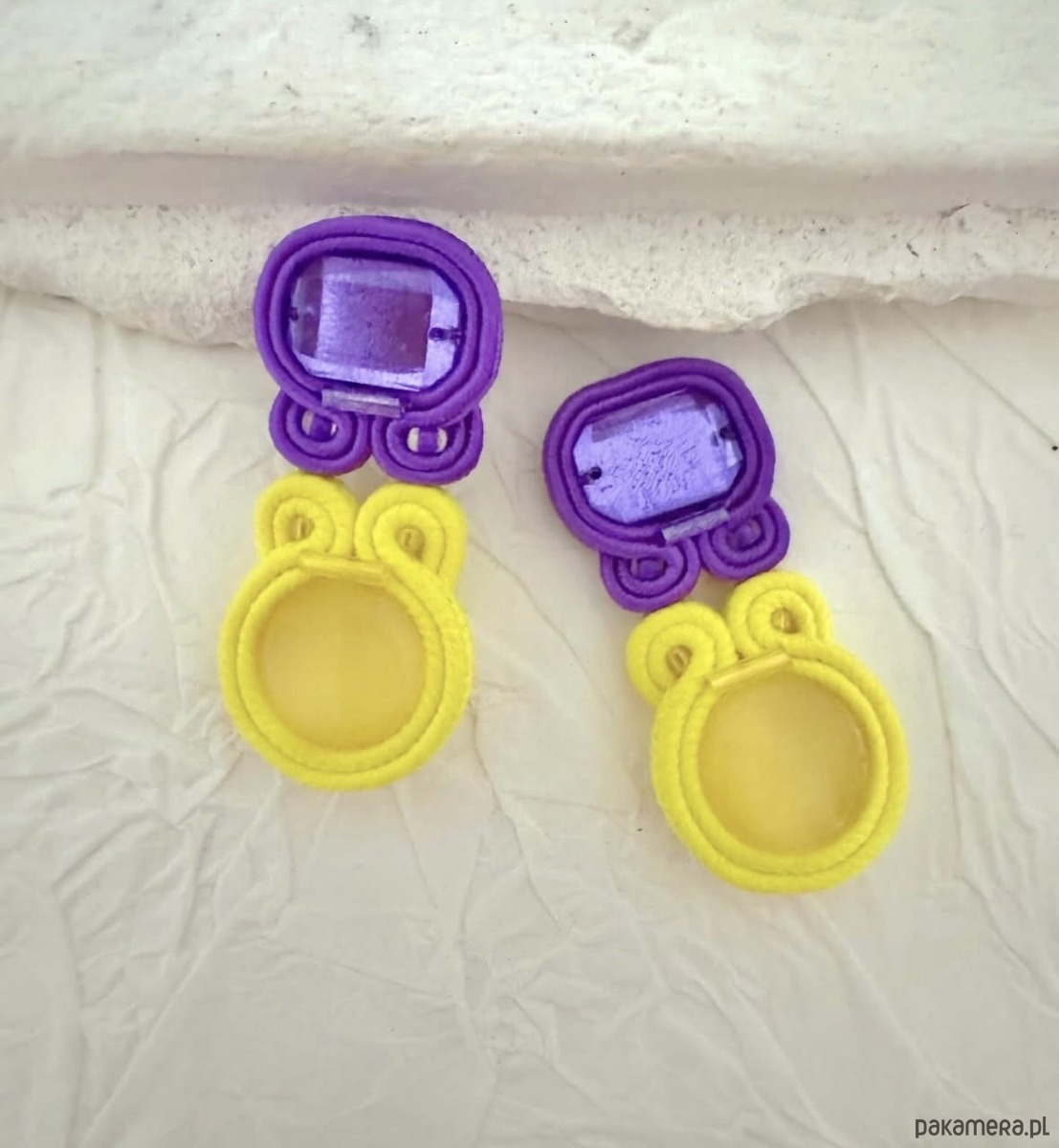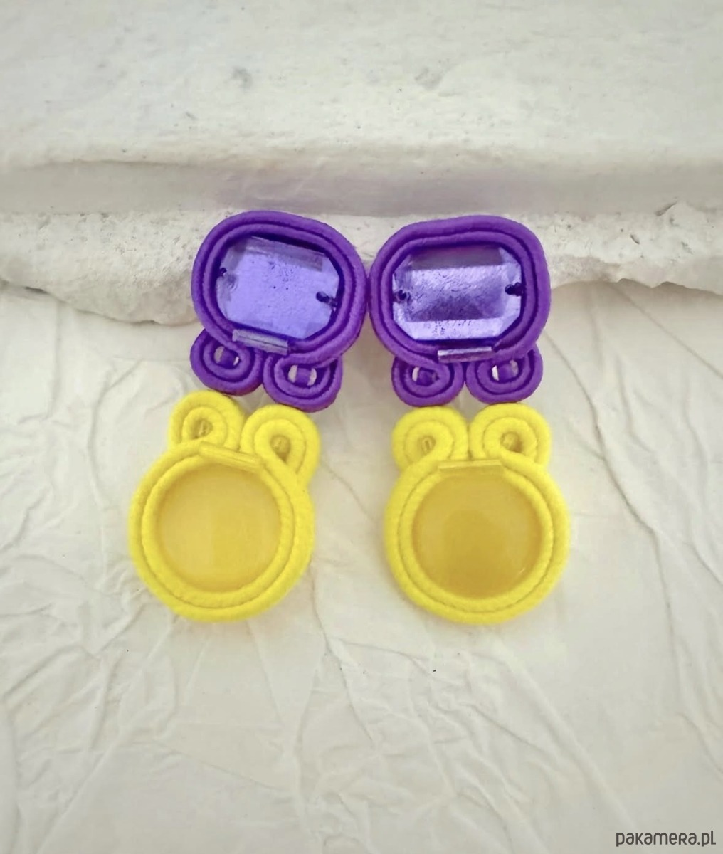 Wyraziste kolczyki sutasz w energetycznym połączeniu fioletu i żółci. Geometryczna forma oraz kontrastowe kolory sprawiają, że przyciągają wzrok i stanowią mocny akcent stylizacji.
