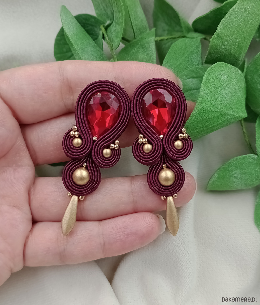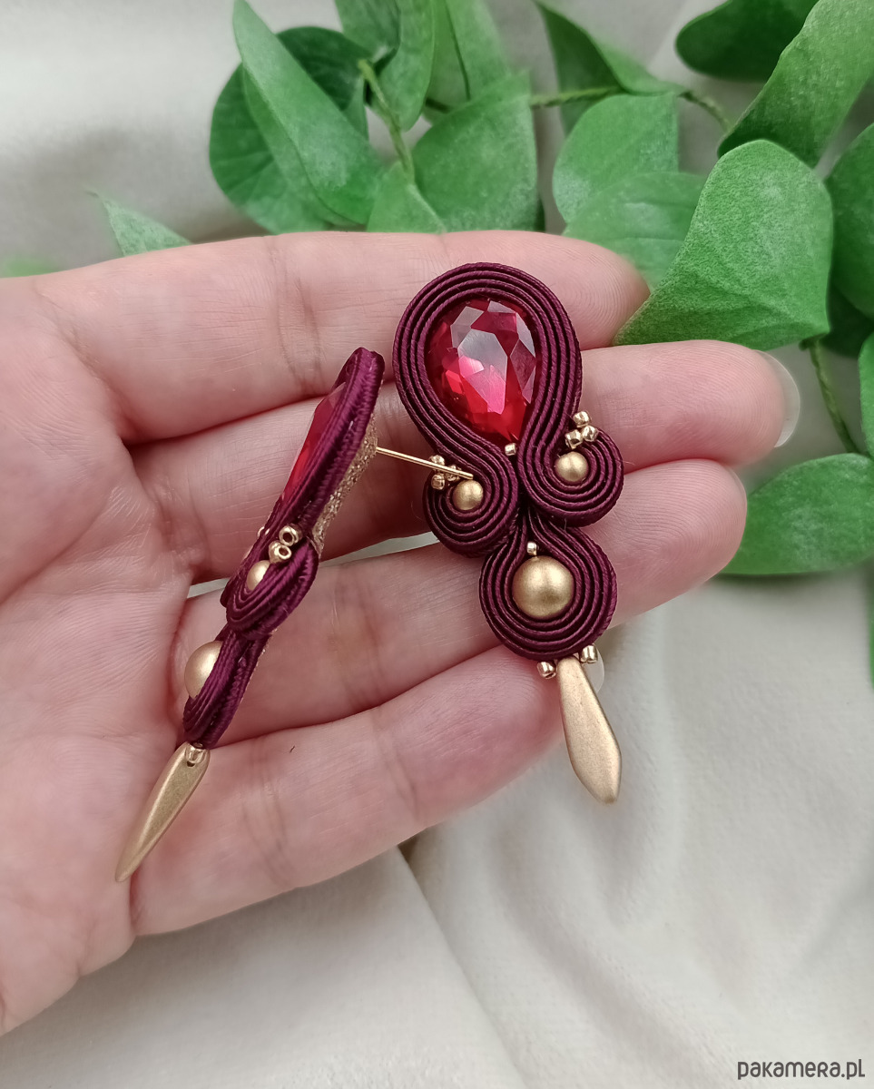 Kolczyki w kolorze bordowej czerwieni i złota dedykowane wielkim wyjściom, przyjęciom, niebanalnym stylizacjom ale przede wszystkim Kobietom kochającym kolorowe dodatki - ręcznie robiona, z jedwabnego włoskiego sutaszu i dodatków najwyższej jakości - w mojej małej pracowni z designerskimi tekstylną biżuterią.