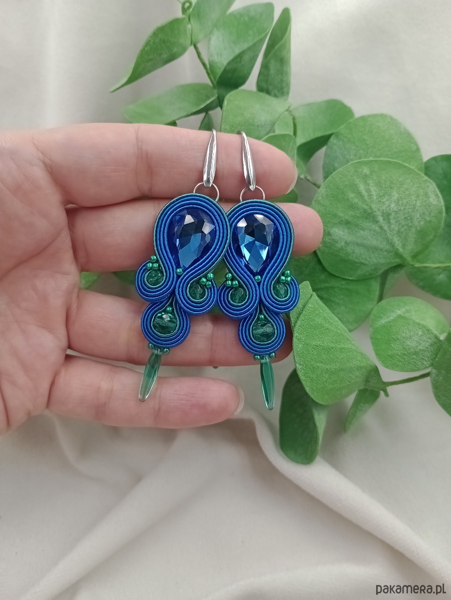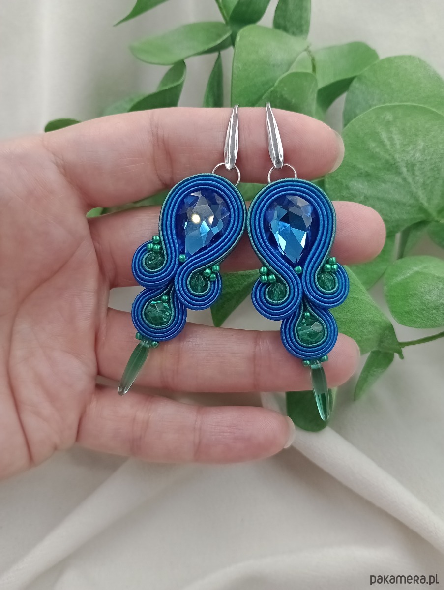 Kolczyki w kolorze zieleni i chabru, niczym kolory pawiego pióra dedykowane wielkim wyjściom, przyjęciom, niebanalnym stylizacjom ale przede wszystkim Kobietom kochającym kolorowe dodatki - ręcznie robiona, z jedwabnego włoskiego sutaszu i dodatków najwyższej jakości - w mojej małej pracowni z designerskimi tekstylną biżuterią.