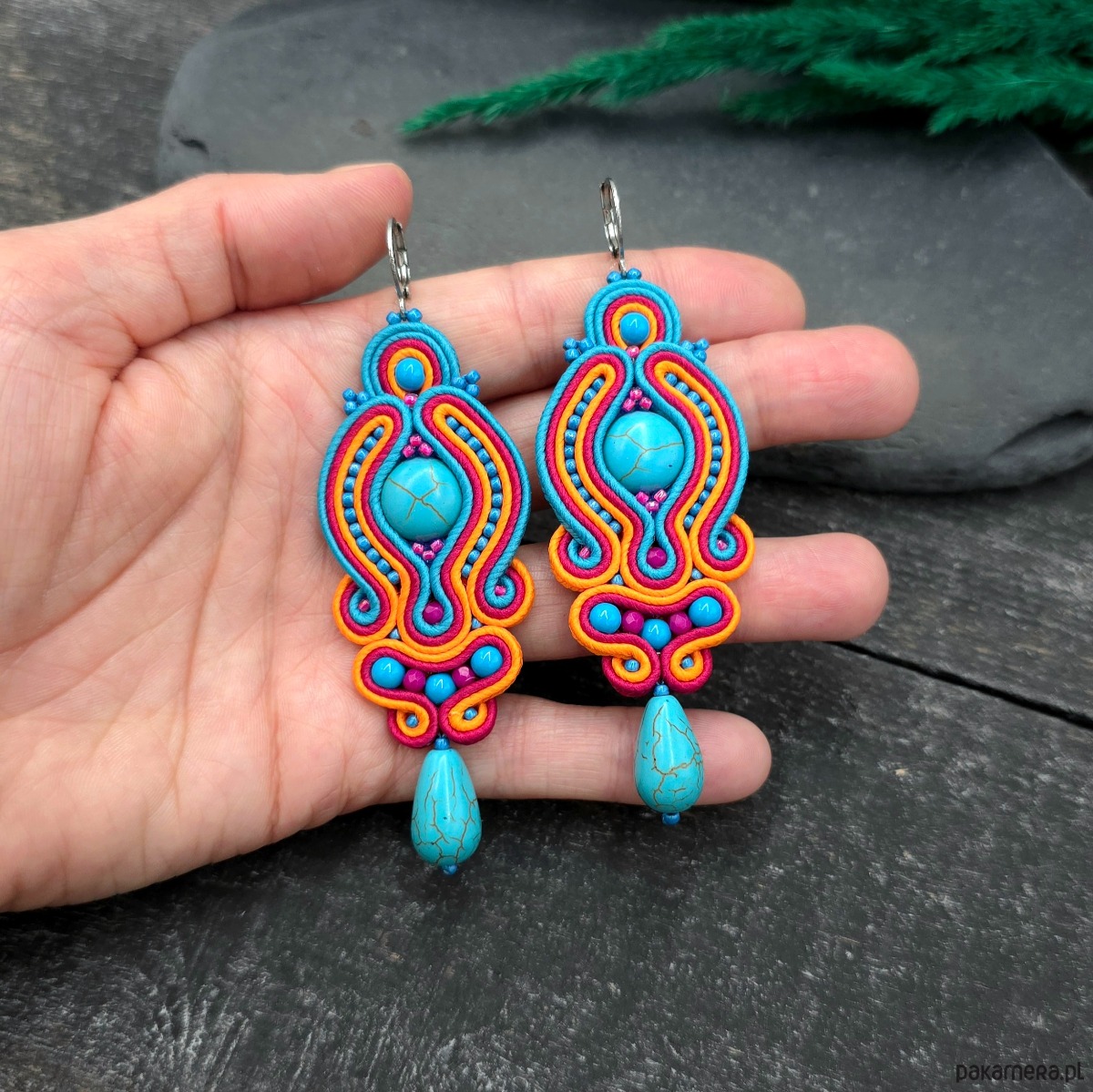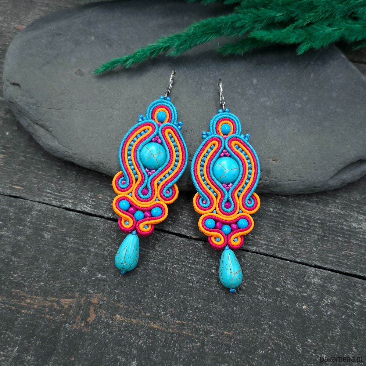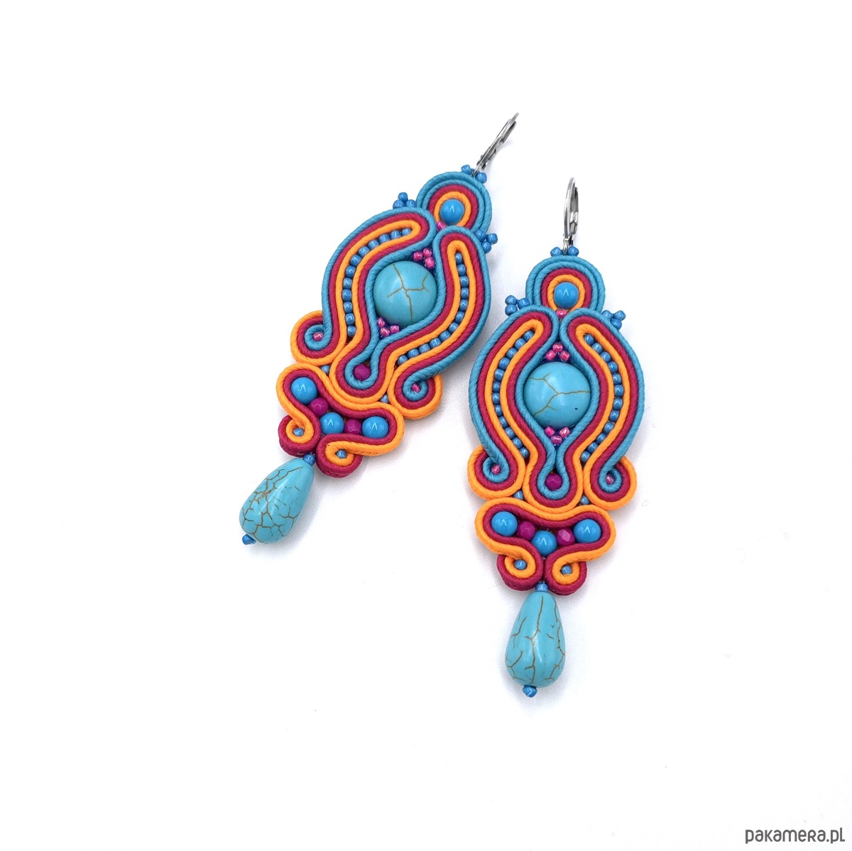 Kolczyki sutasz z howlitami w intensywnych kolorach turkusu, pomarańczu i fuksji.