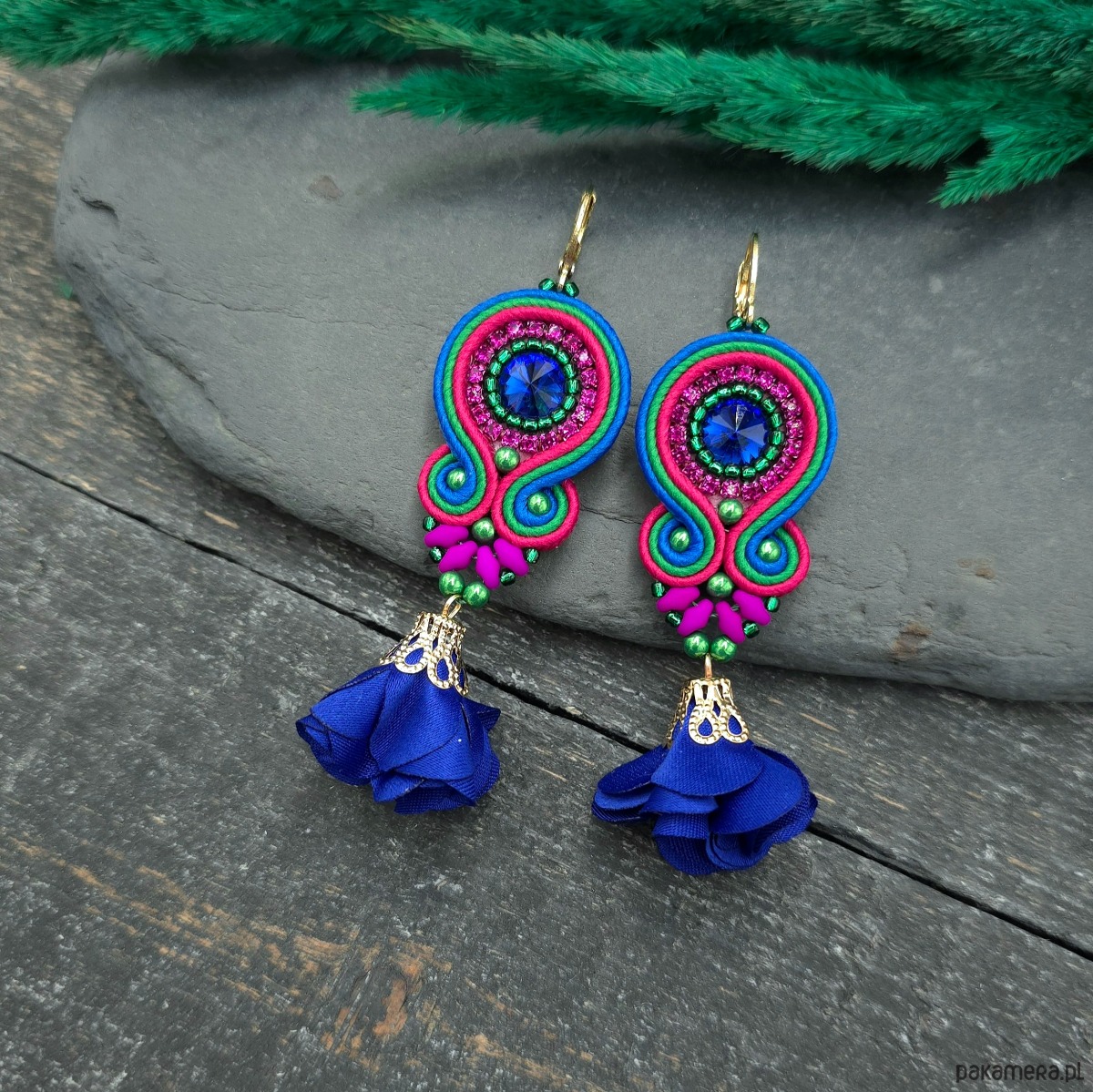 kaboszony kryształki, taśma z cyrkoniami, koraliki Toho, koraliki Round Beads, koraliki SuperDuo, materiałowe kwiatki, greckie sznurki sutasz, bigle ze stali chirurgicznej.