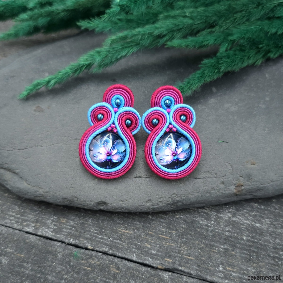 kaboszony z grafiką kwiatów, koraliki Round Beads, koraliki Toho, czeskie i greckie sznurki sutasz, sztyfty ze stali chirurgicznej.