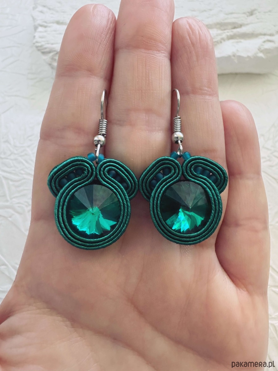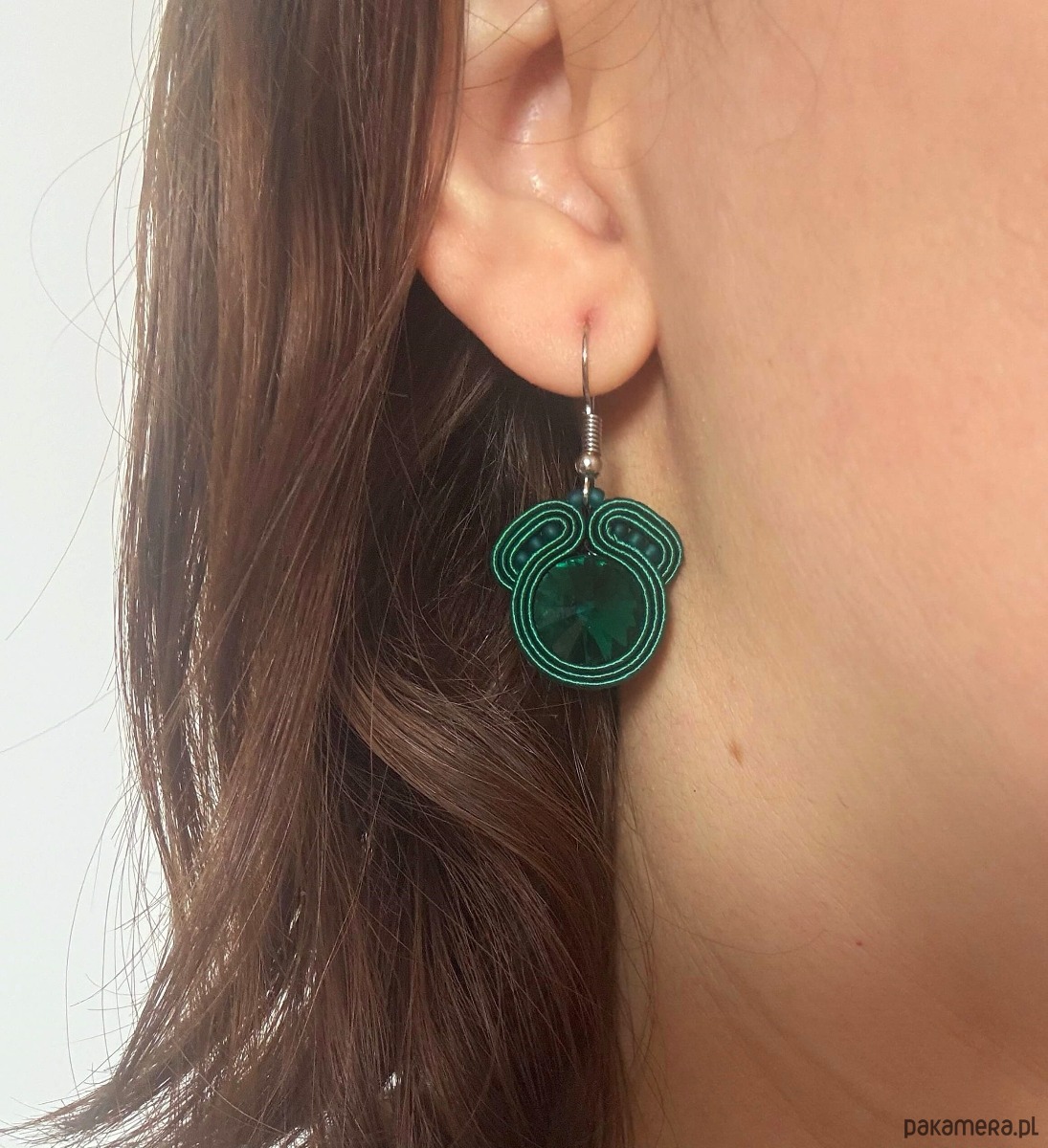 Ręcznie robione kolczyki w technice haftu sutasz z efektownym kryształem w głębokim, zielonym odcieniu.