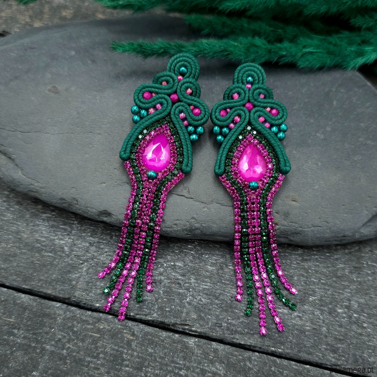 Długie kolczyki sutasz w kolorze zielono-fuksjowym to wyjątkowa propozycja na wieczorowe wyjścia i karnawałowe stylizacje.
