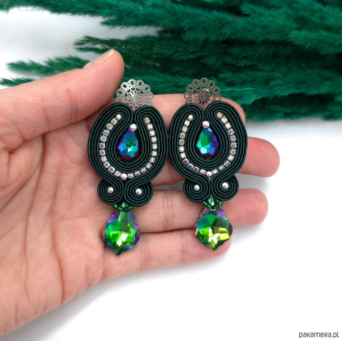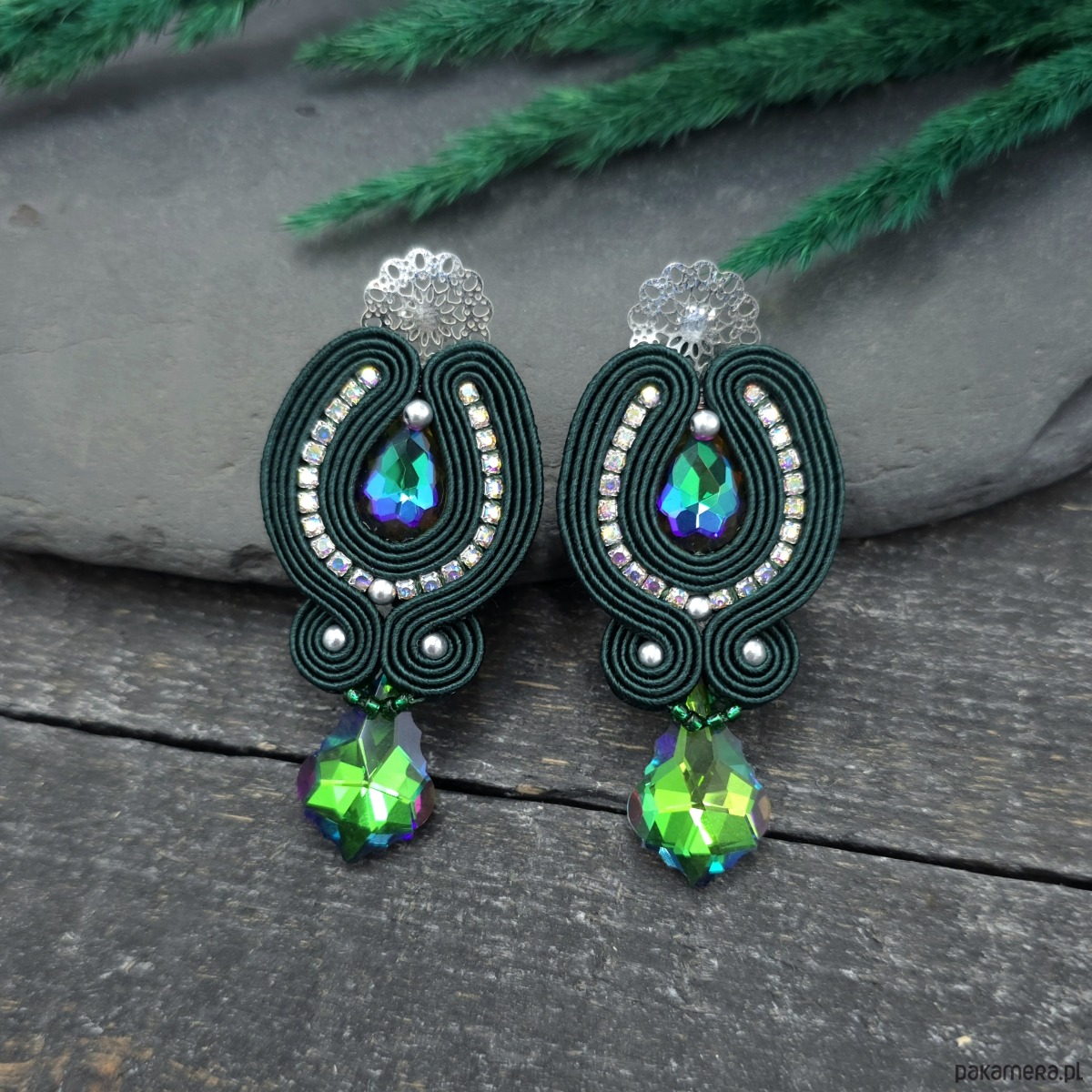 Ręcznie wykonane kolczyki z sutaszu w zielonym kolorze, zachwycają blaskiem kryształków oraz elegancką formą idealną na wieczorne wyjścia.