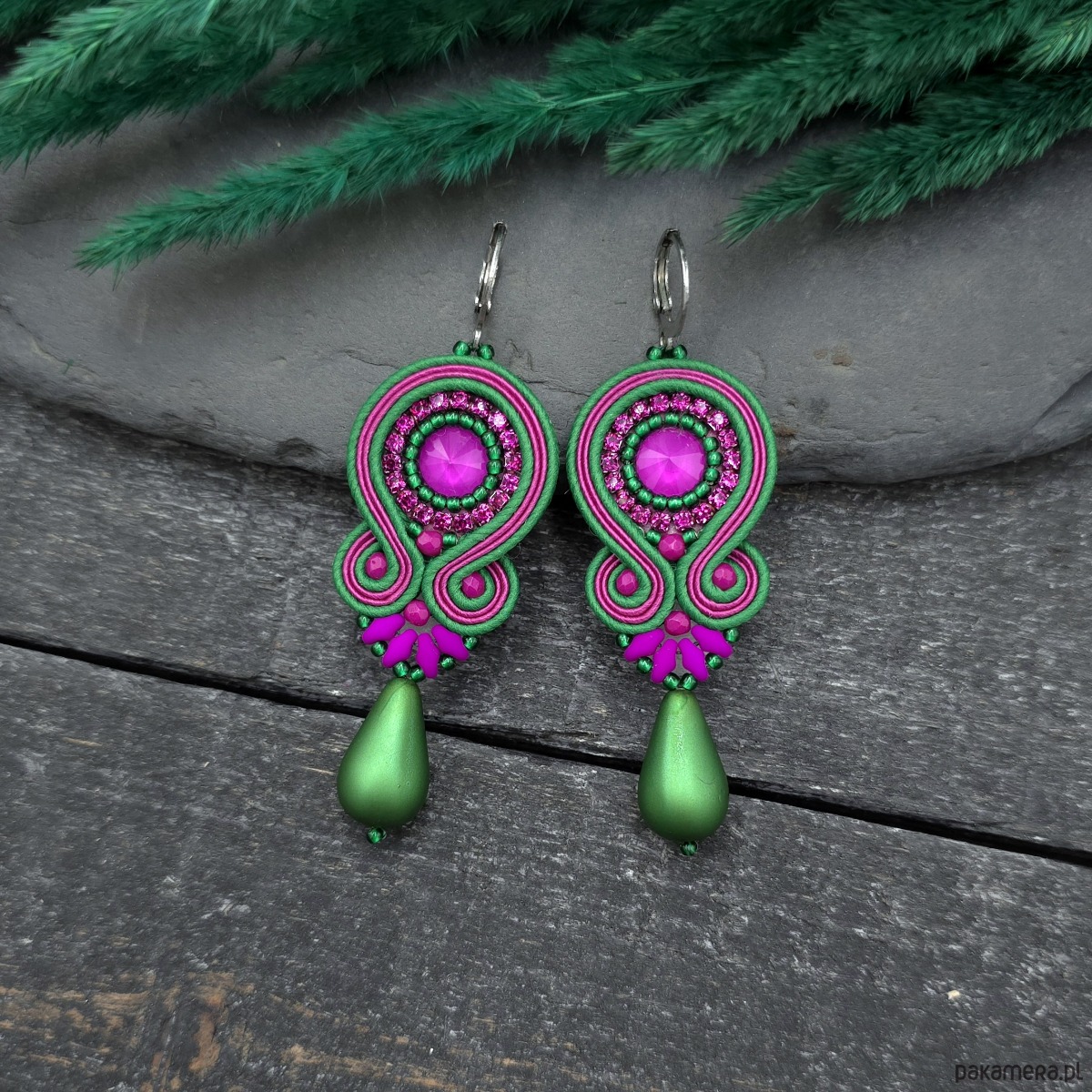 Kolczyki sutasz zielono fuksjowe kolorowe Cleo z dużą łezką