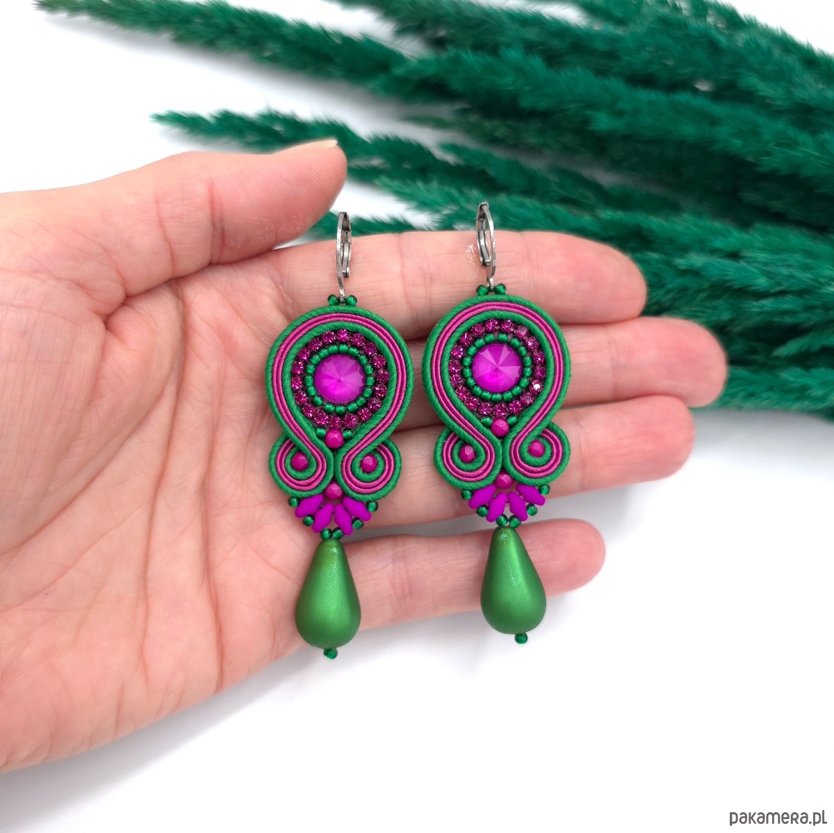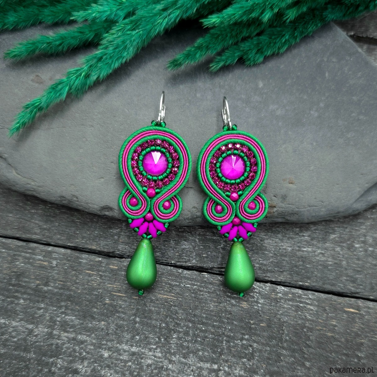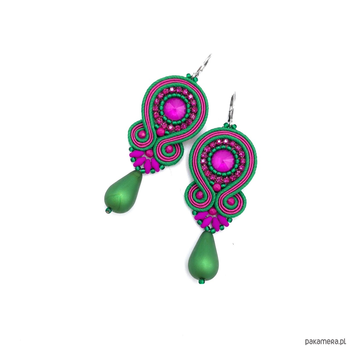 Kolczyki sutasz zielono fuksjowe kolorowe wiosenne z dużą łezką Cleo