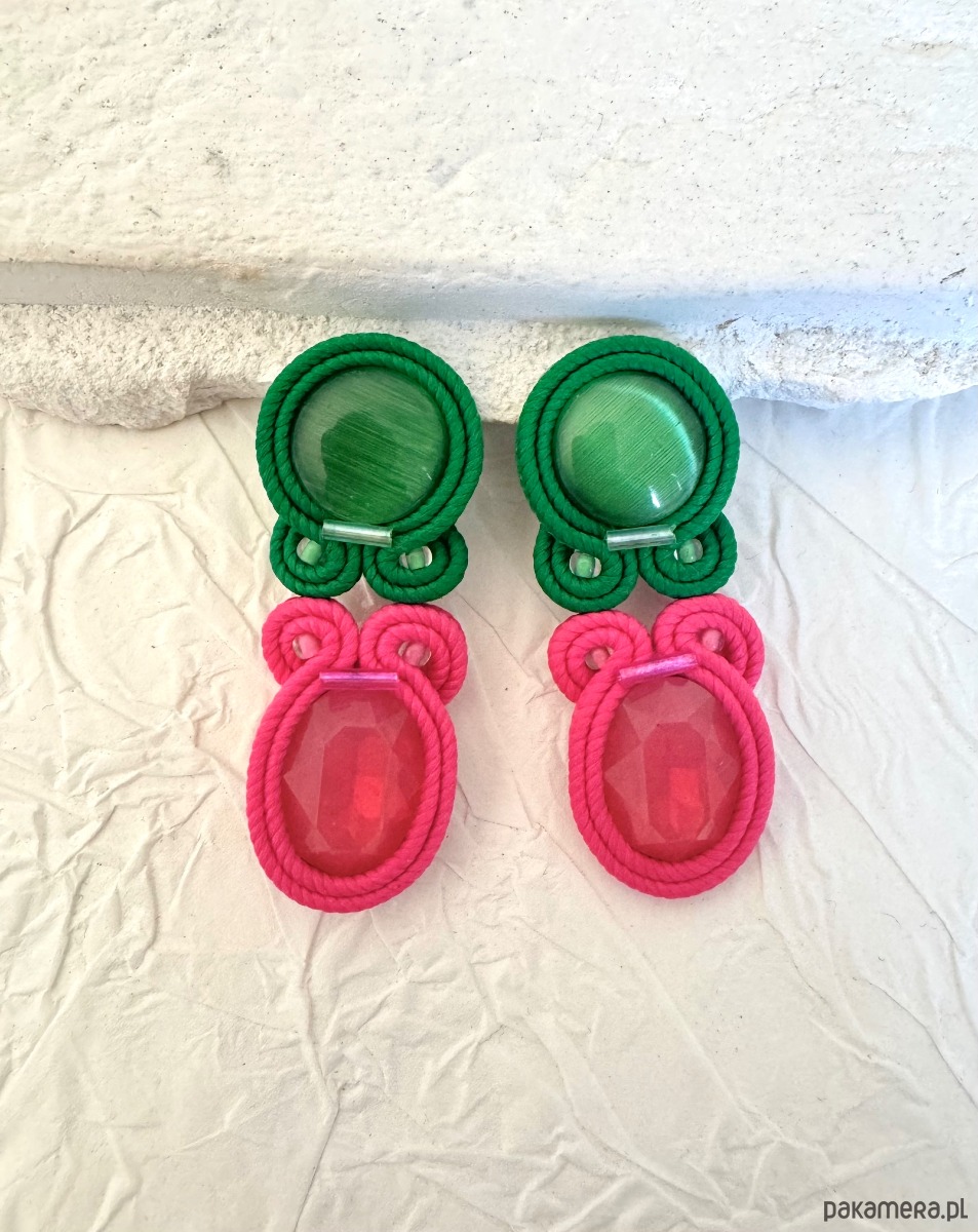Efektowne kolczyki sutasz w wyrazistym połączeniu zieleni i intensywnego różu. Kontrastowe kolory oraz owalna forma sprawiają, że kolczyki przyciągają uwagę i ożywiają nawet prostą stylizację.