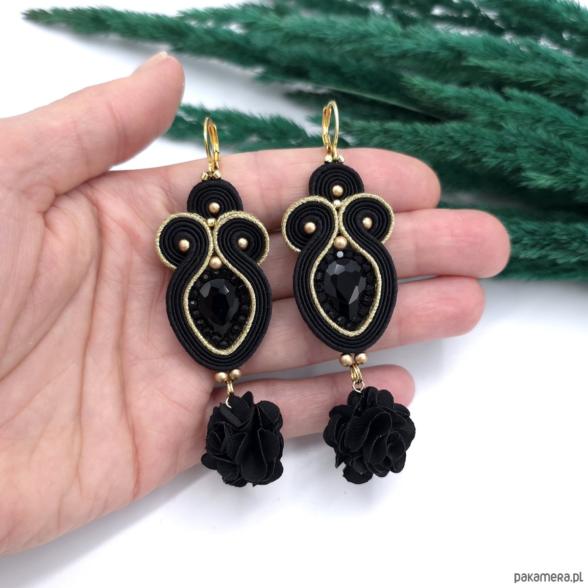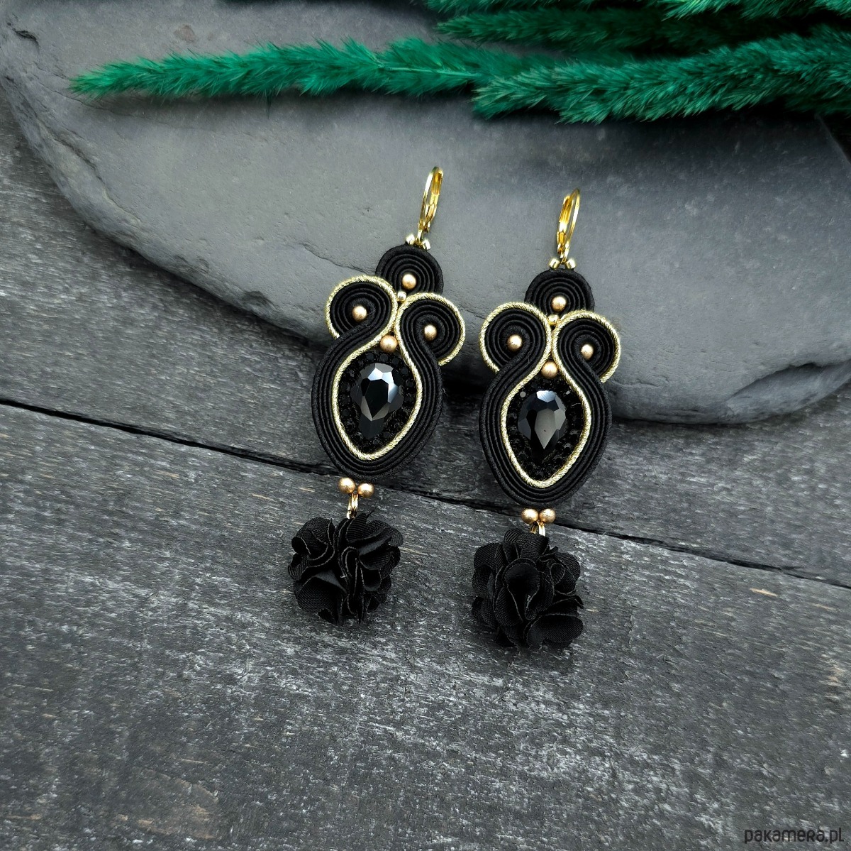 Kolczyki sutasz złoto czarne Rosalia z kryształkiem i kwiatkiem