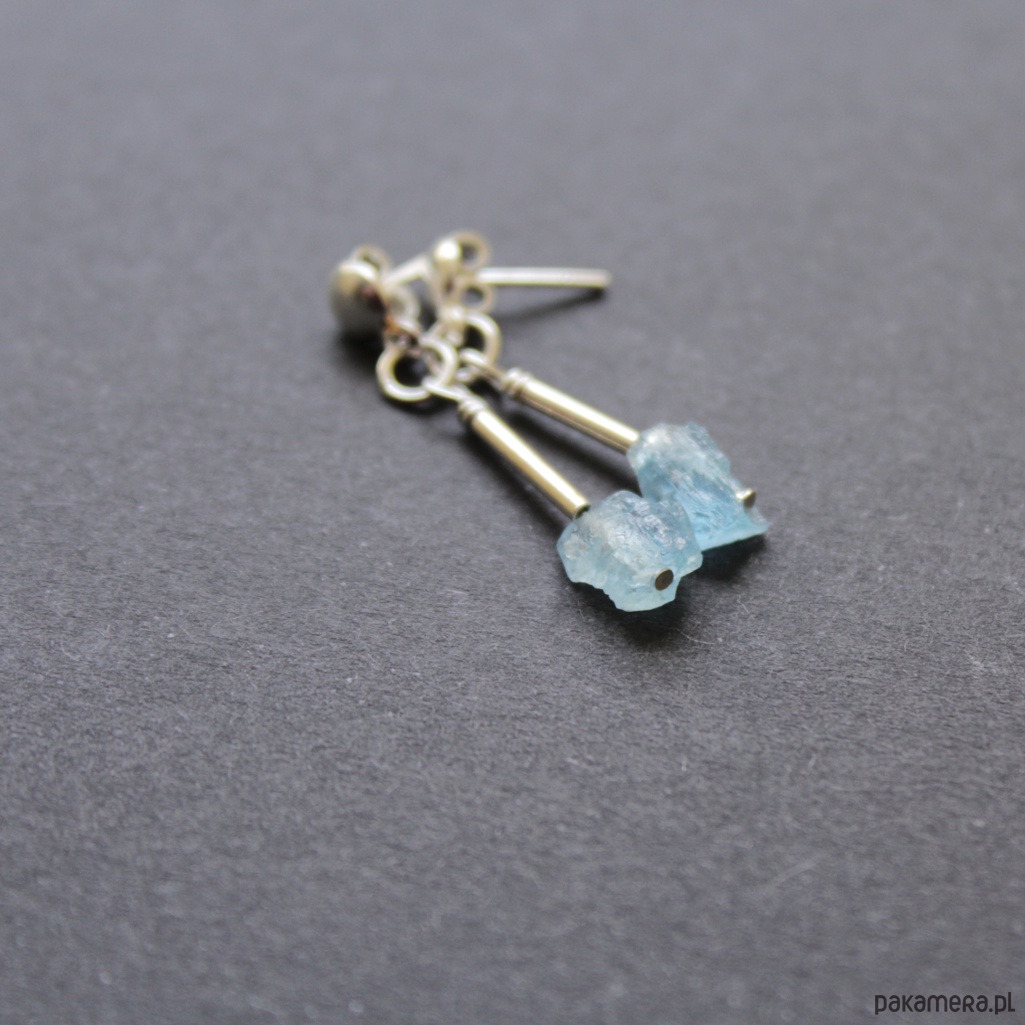 Kolczyki wykonane zostały ze srebra próby 925 oraz surowych bryłek akwamarynów wielkości 0,4 cm.