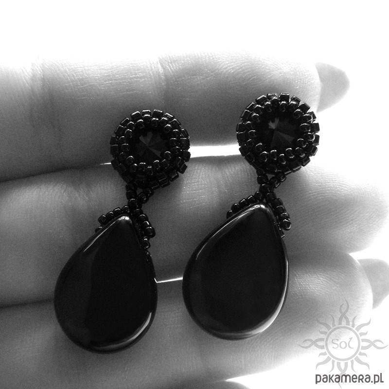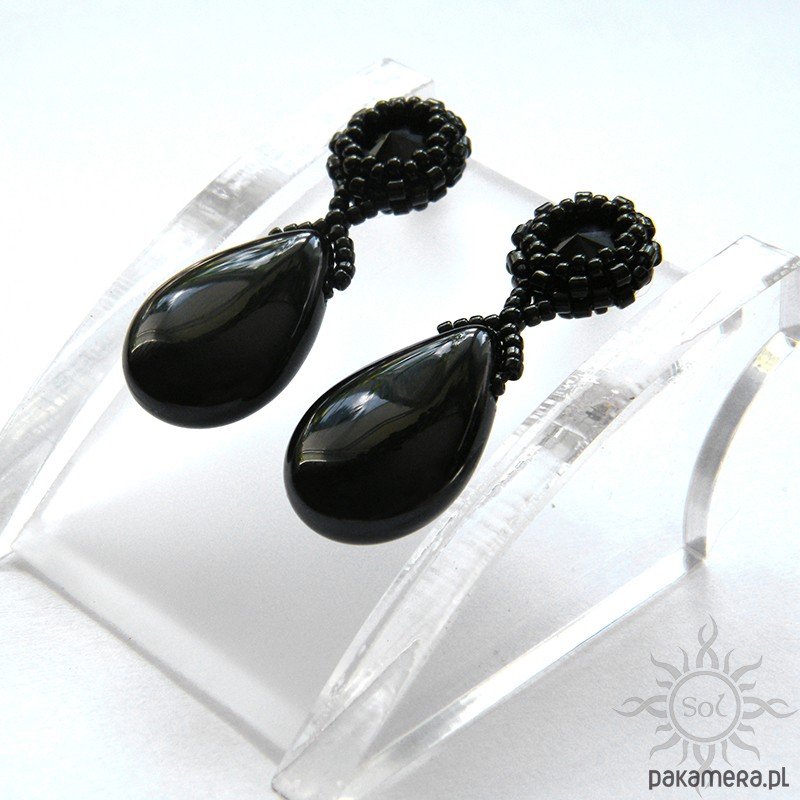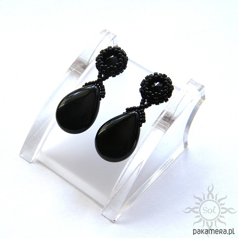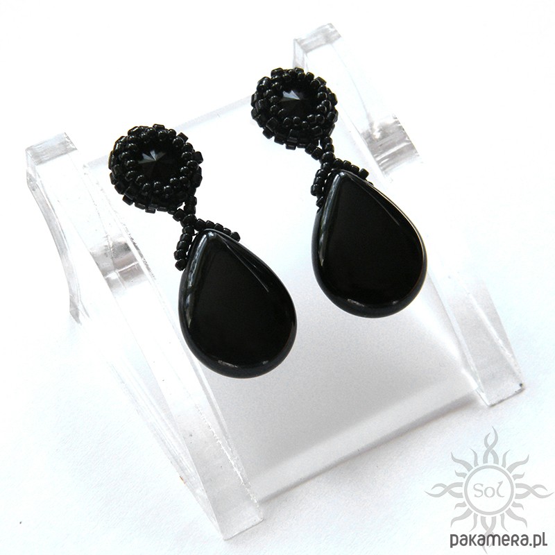 Ich serce stanowią gładkie krople onyksu i kryształy rivoli Swarovskiego w kolorze jet, oplecione najwyższej jakości japońskimi koralikami TOHO w kolorze czarnym.
