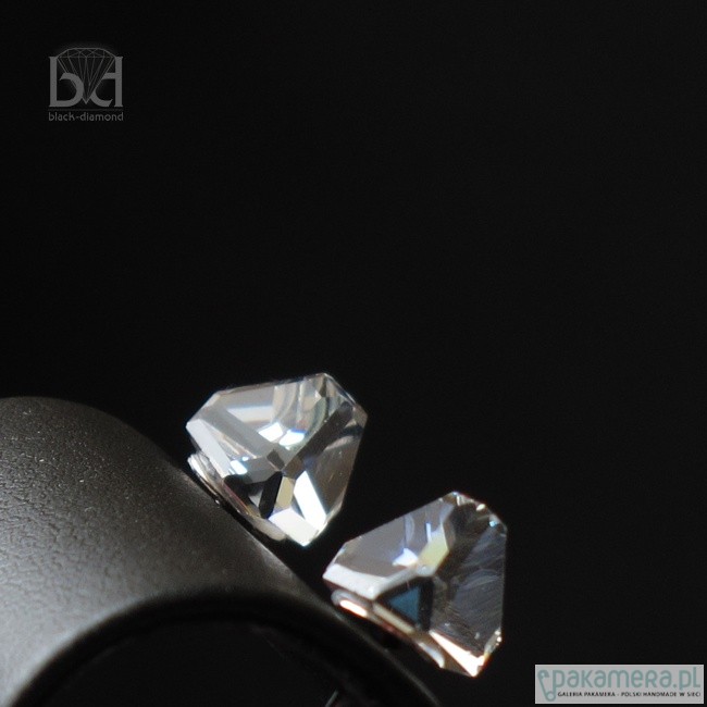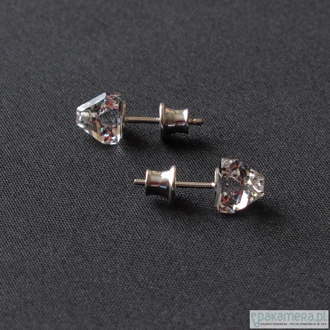 Sztyfty wykonane w całości ze srebra oraz kryształów Swarovski (bezbarwne, wystają od ucha na długość ok 6 mm średnicy). Sztyfty posiadają zapięcia (baranki) ze srebra z silikonem - są wygodniejsze i stabilniejsze od zatyczek innego typu. Kolczyki otrzymasz wraz z małym pudełeczkiem jubilerskim.