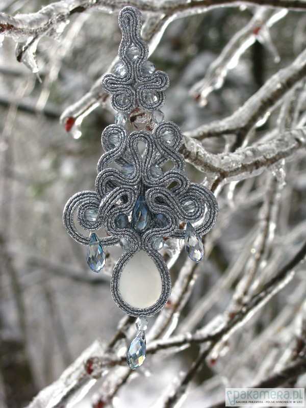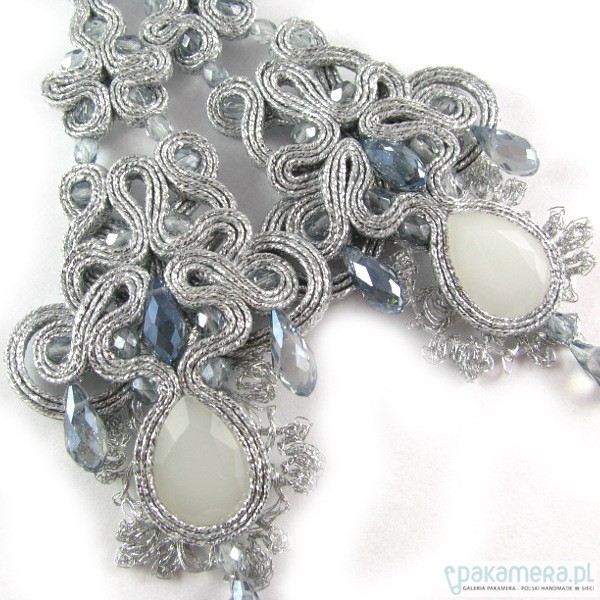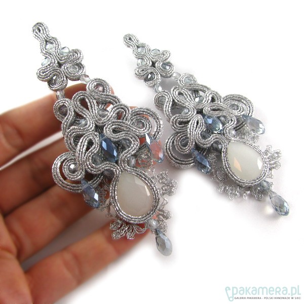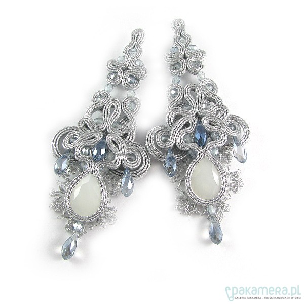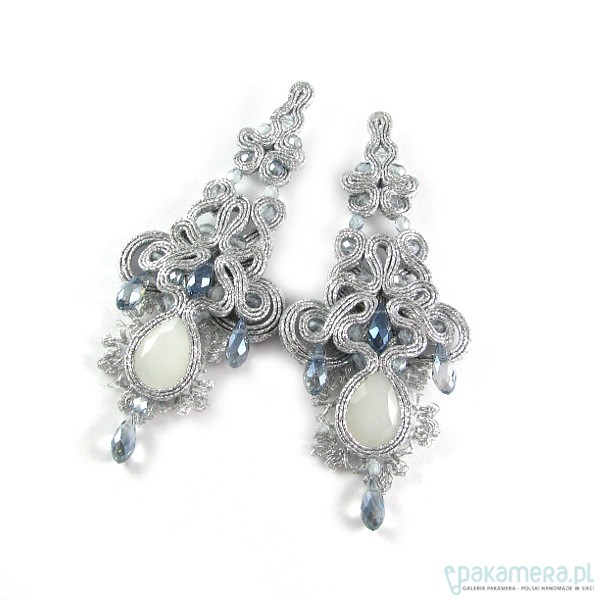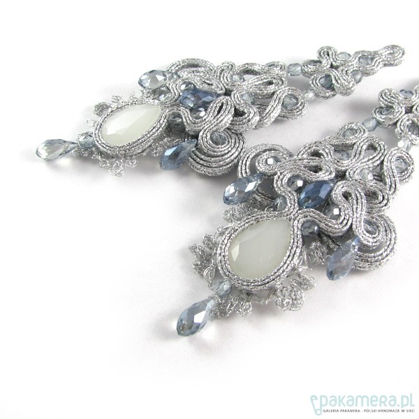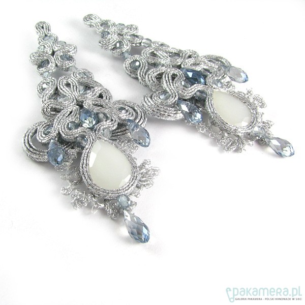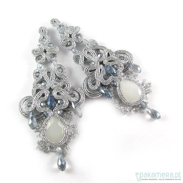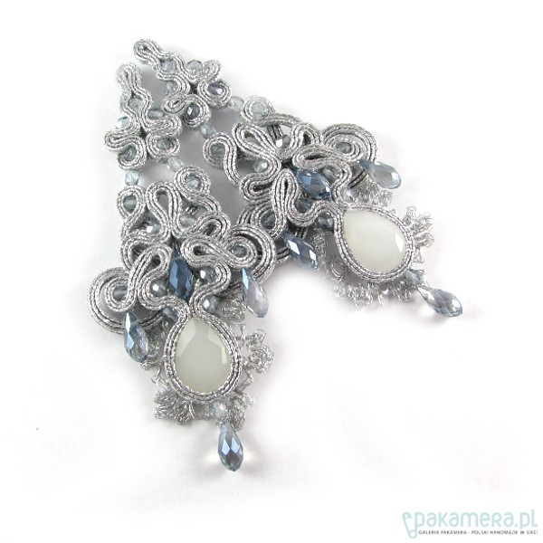 Bogato zdobione kryształami kolczyki ślubne. Wyhaftowane z metalizowanego, srebrnego sutaszu. Filigranowa, ażurowa, przestrzenna forma. Kolczyki są dwustronne, tył podbity tylko punktowo atłasem. Mocowane na sztyftach wykonanych ze srebra 925. Lekkie i kobiece. Dł. 11 cm