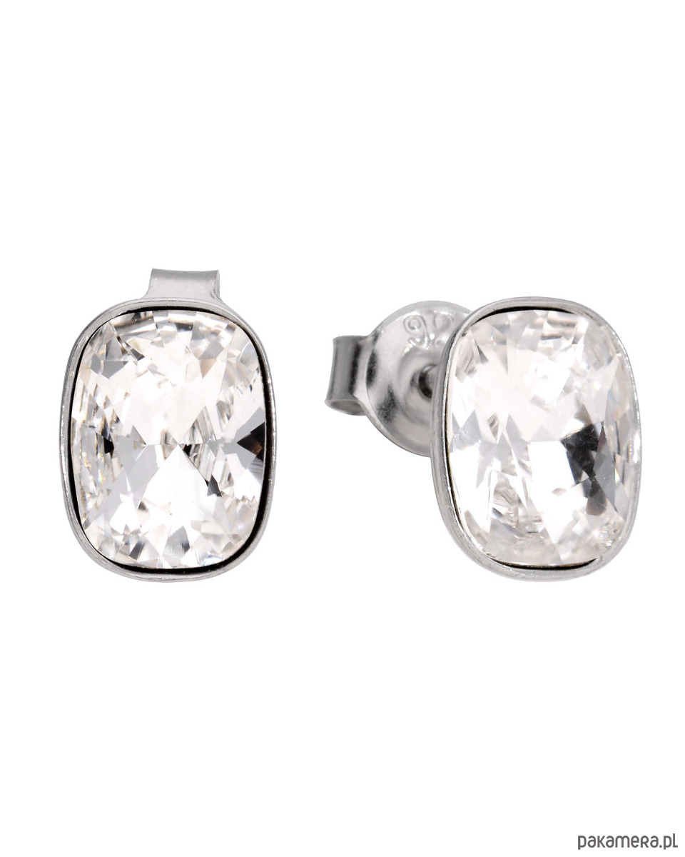 Drobne kolczyki sztyfty z małymi, białymi kryształami Swarovski o ciekawym kształcie lekko zaokrąglonego prostokąta o pięknym, skomplikowanym cięciu. Dzięki niemu błyszczą się niczym szlachetne kamienie.