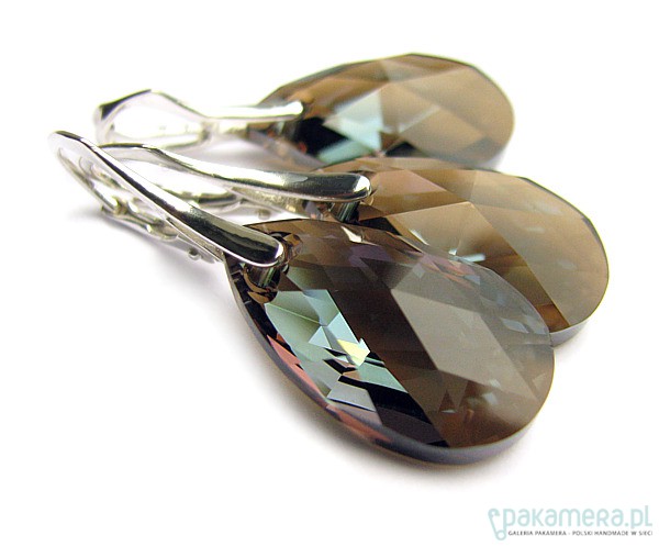 Bajecznie migoczące odcieniami zgaszonego brązu i jesiennego błękitu kolczyki wykonane z pięknych, 22-milimetrowych kryształów Swarovskiego w odcieniu Crystal Bronze Shade oraz srebra w postaci wygodnych i bezpiecznych bigli angielskich. Całkowita długość kolczyków to ok. 3,8 cm. Na drugim zdjęciu kolczyki pokazane są w towarzystwie wisiora Bronze Classic, który także można nabyć w mojej ekspozycji w Pakamerze.