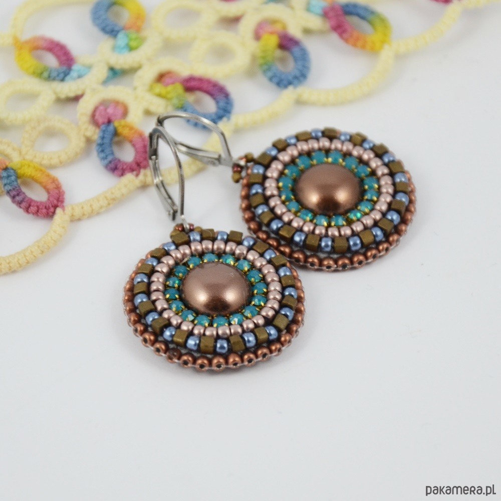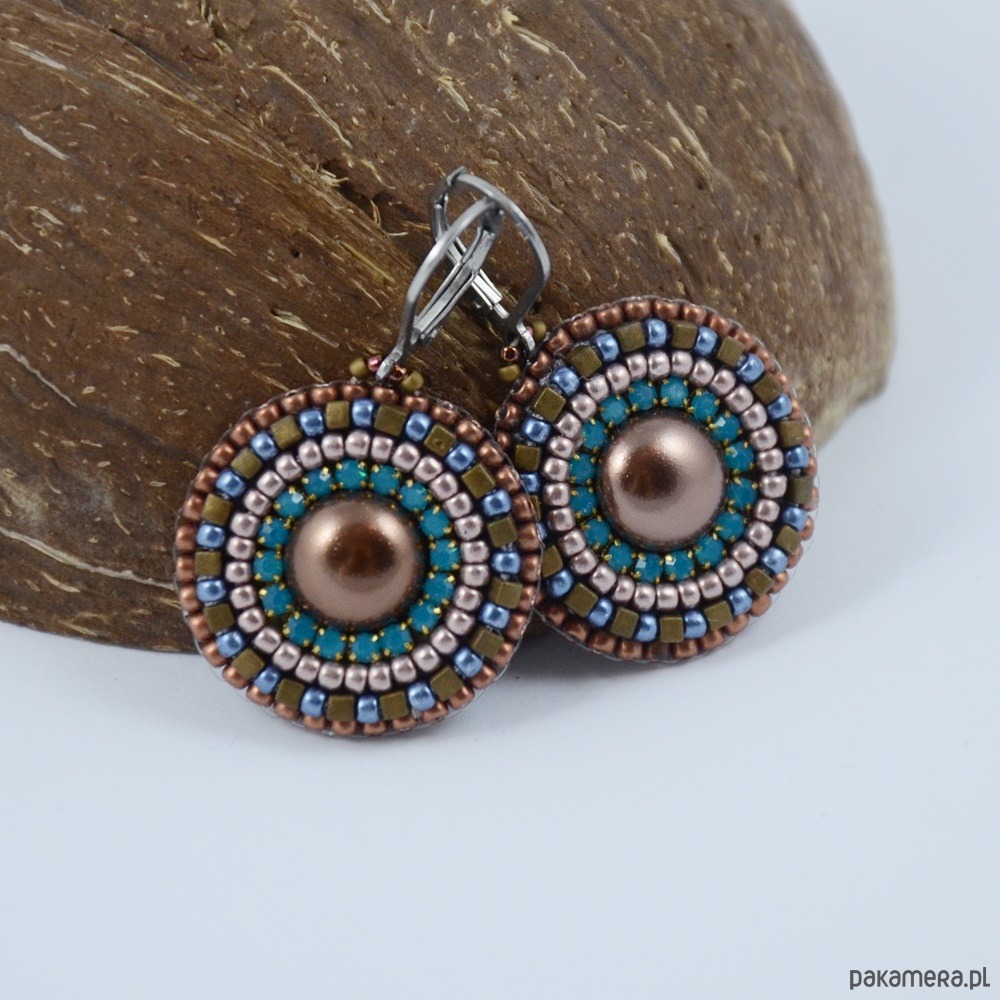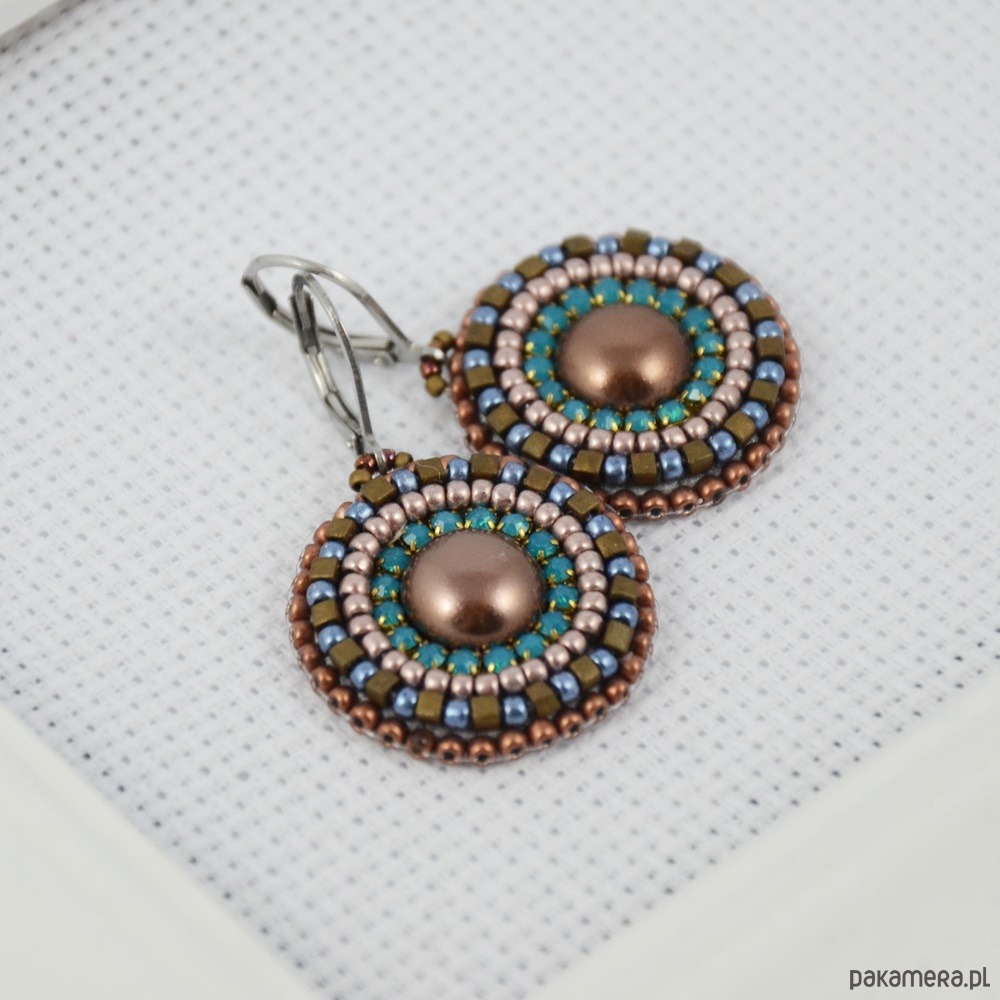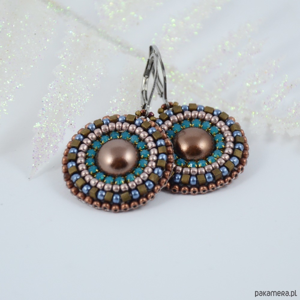 Niewielkie, wdzięczne i eleganckie kolczyki wykonane w technice haftu koralikowego. W centrum szklana perła Swarovski w otulinie koralików Toho i taśmy cyrkoniowej. Wykończenie od tyłu skórka licowa. Bigle angielskie stal chirurgiczna. Średnica kolczyka ok. 2,5 cm.