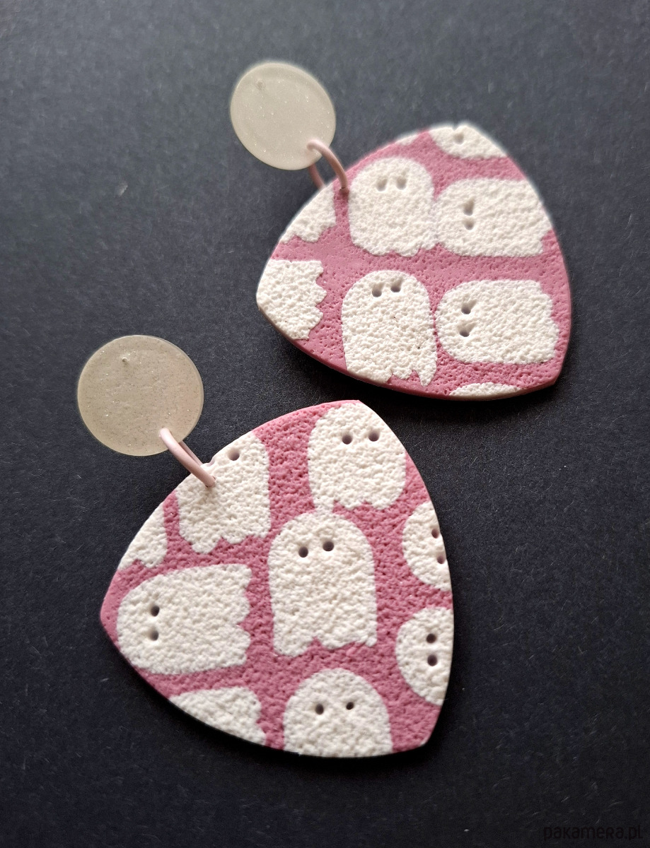 Lekkie sztyfty wykonane z wysokiej jakości glinki polimerowej z dodatkiem ozdobnych elementów akrylowych. Sztyfty posrebrzane i nieuczulające. Wymiary kolczyków: długość całkowita: 6,5 cm, szerokość max. 4,5 cm.