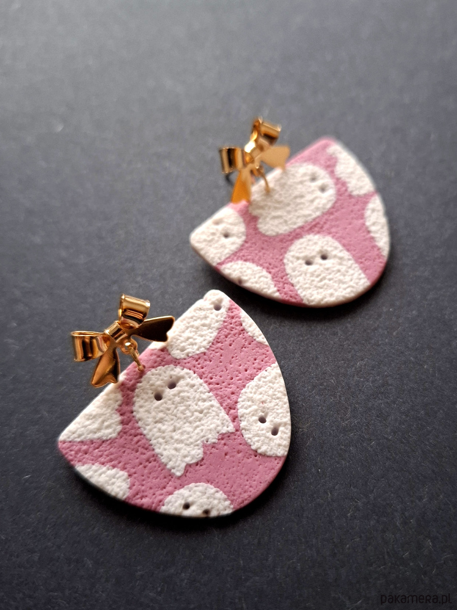Lekkie kolczyki wykonane z wysokiej jakości glinki polimerowej z dodatkiem ozdobnych sztyftów w kształcie kokardek. Sztyfty pozłacane i nieuczulające. Wymiary kolczyków: długość całkowita: 4 cm, szerokość max. 3,5 cm.