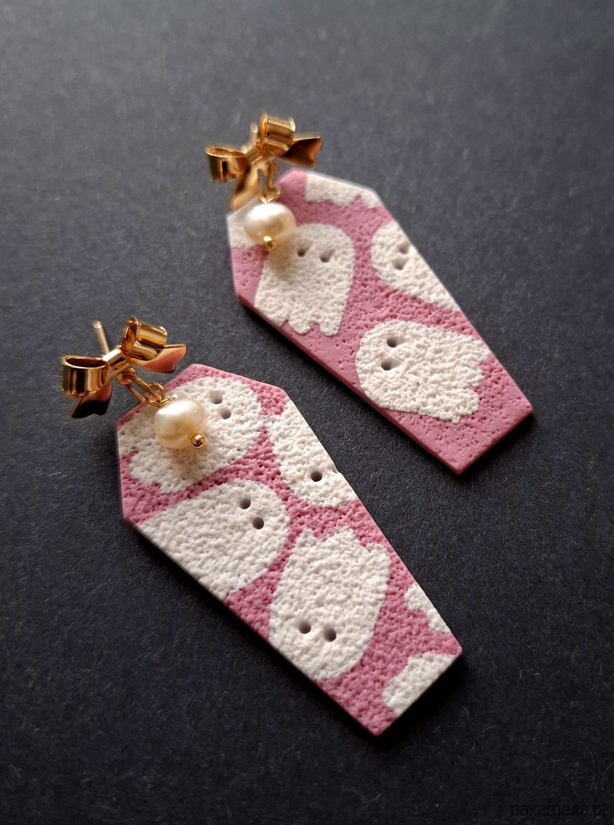 Lekkie kolczyki wykonane z wysokiej jakości glinki polimerowej z dodatkiem ozdobnych sztyftów w kształcie kokardek oraz naturalnych pereł. Sztyfty pozłacane i nieuczulające. Wymiary kolczyków: długość całkowita: 6 cm, szerokość max. 2,5 cm.