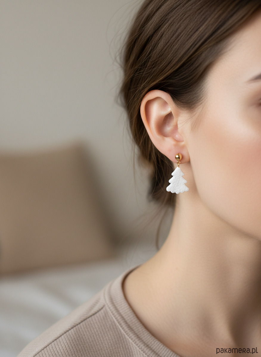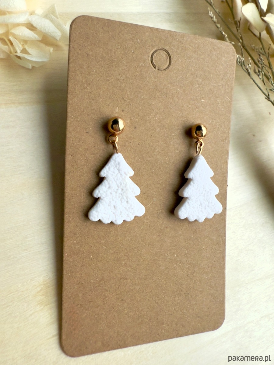 Delikatne, świąteczne kolczyki w kształcie białych choinek, wykonane z gliny polimerowej o subtelnej, strukturalnej powierzchni. Złote lub srebrne kulki przy sztyftach dodają im elegancji, a jednocześnie całość pozostaje lekka i uniwersalna – idealna do codziennych, zimowych stylizacji.