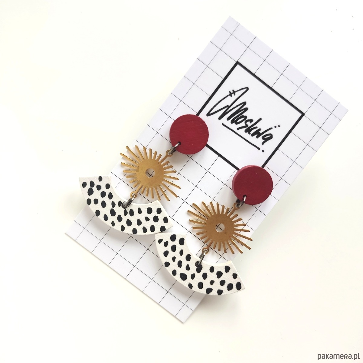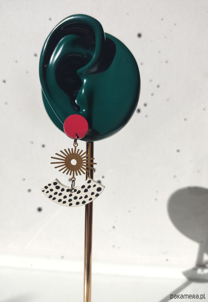 Kolczyki wykonane z drewna i mosiądzu, bardzo lekkie; ręcznie malowane, sztyfty ze stali chirurgicznej. Każdy egzemplarz jest nieco inny.