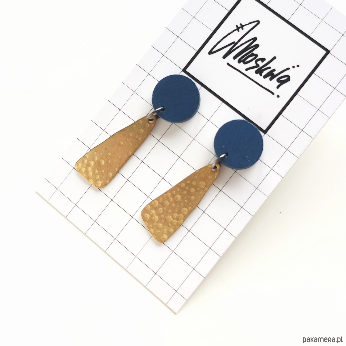 Kolczyki wykonane z drewna i mosiądzu, bardzo lekkie; ręcznie malowane, sztyfty ze stali chirurgicznej. Każdy egzemplarz jest nieco inny.