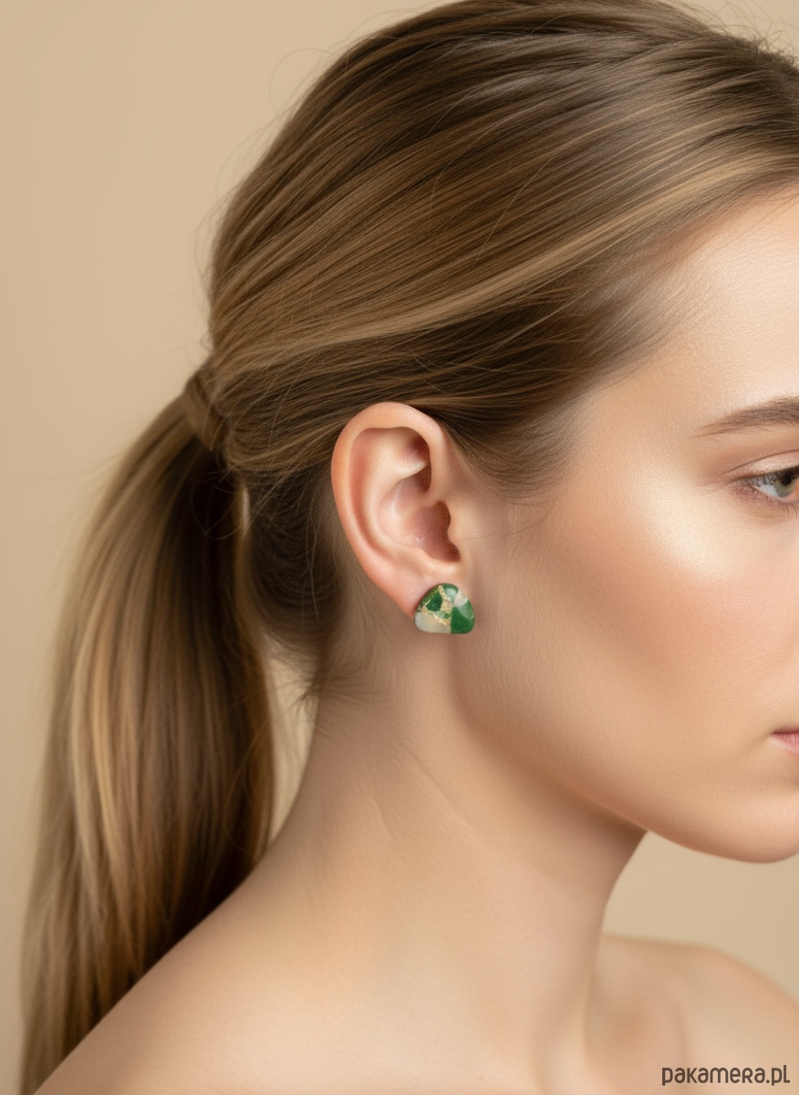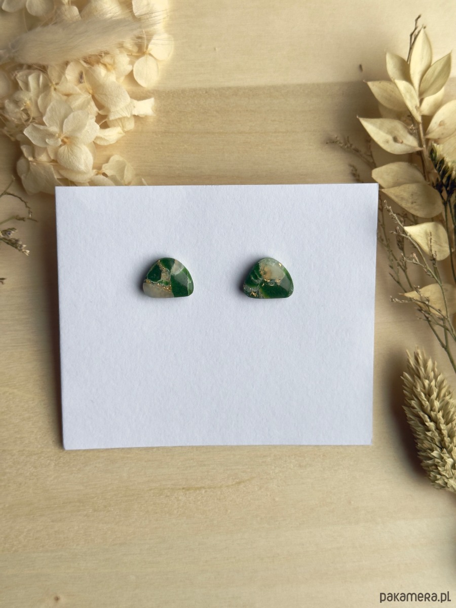 Delikatne, sztyftowe kolczyki z gliny polimerowej, tworzone z ręcznie mieszanej masy o efekcie zielonego „kamienia” z subtelnymi, złotymi drobinkami. Dzięki niewielkiemu rozmiarowi pięknie podkreślają ucho, dodając świątecznego akcentu zarówno do codziennych, jak i bardziej eleganckich stylizacji.