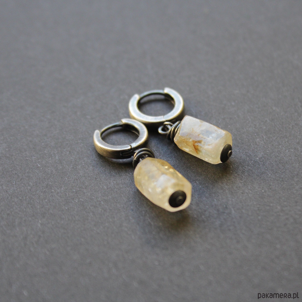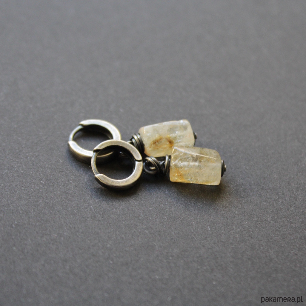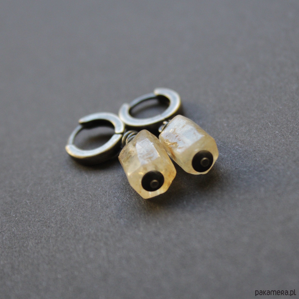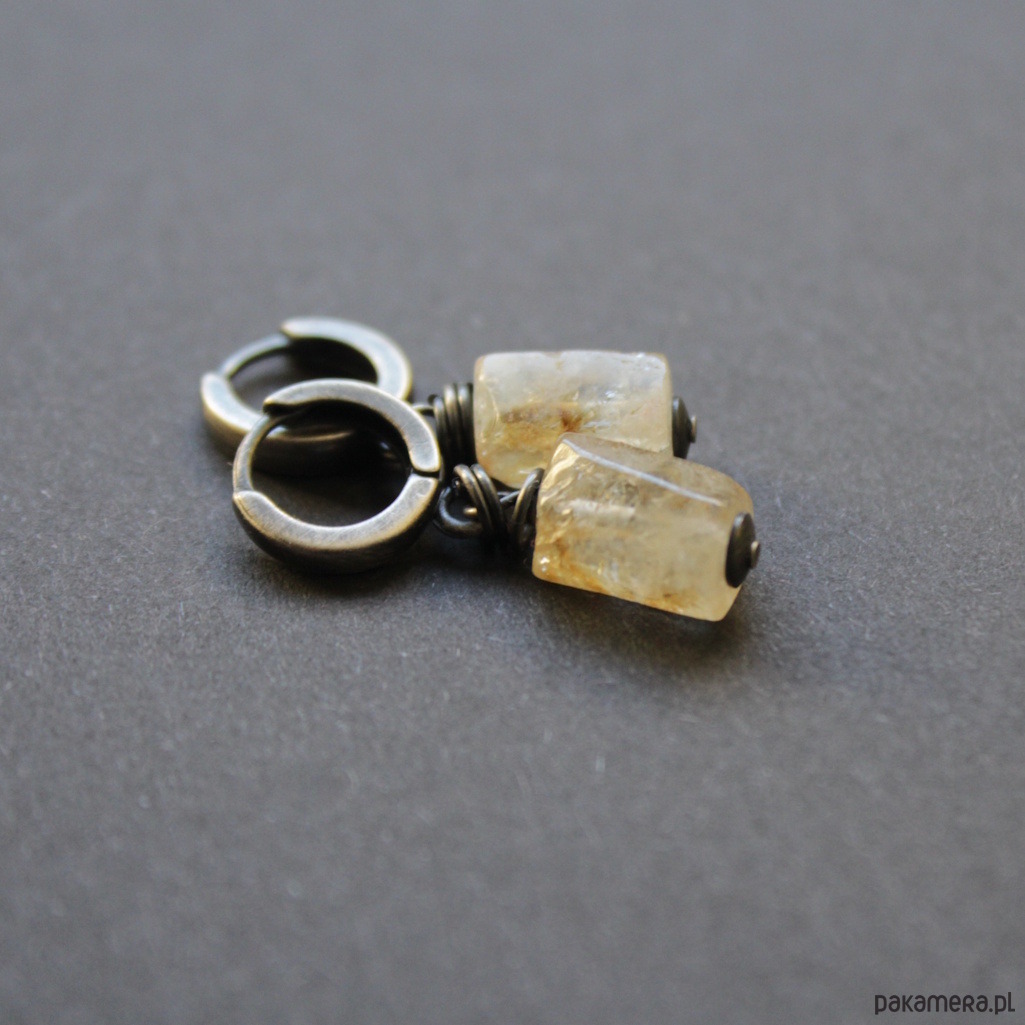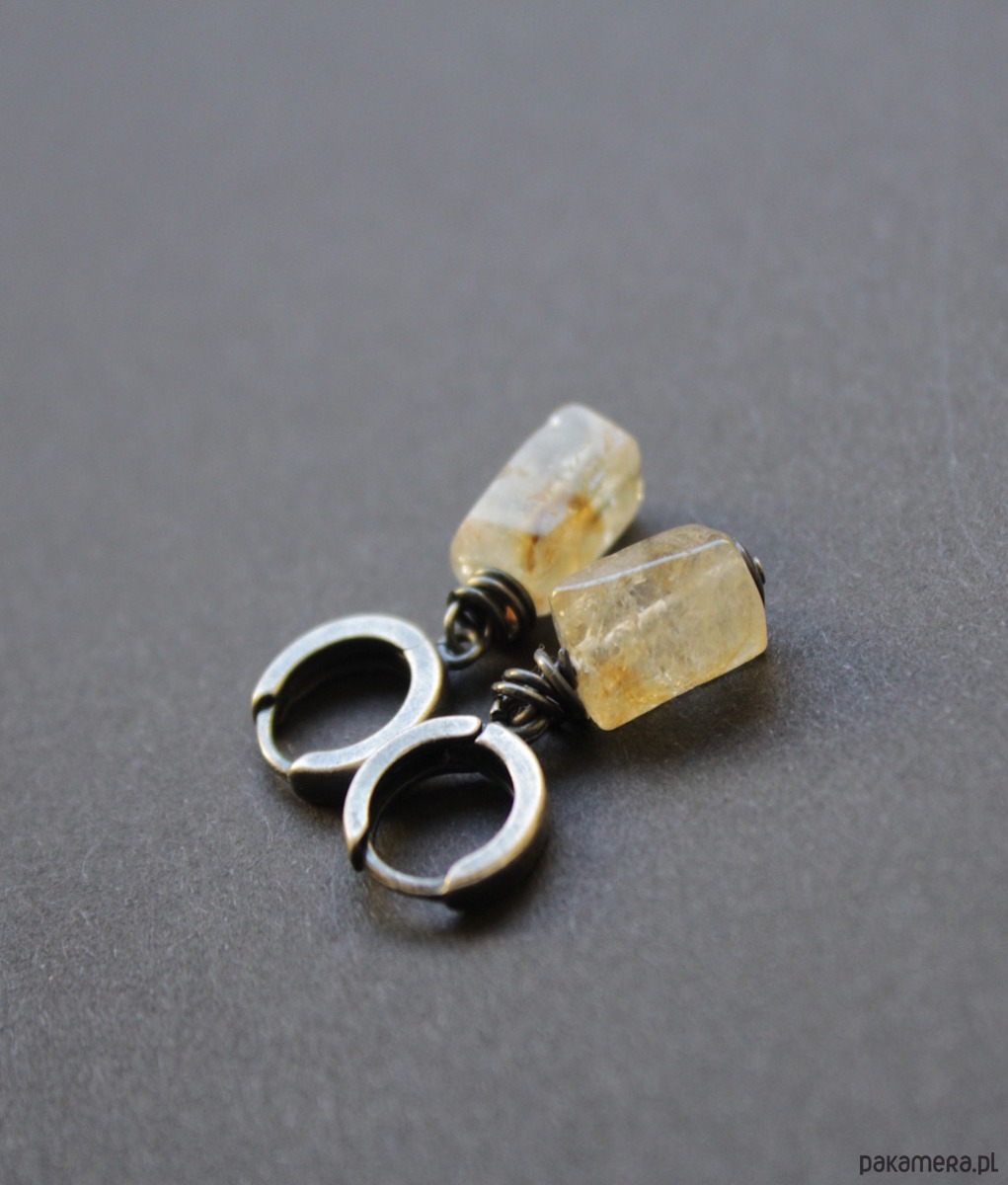 Minimalistyczne kolczyki wykonane zostały z oksydowanego srebra próby 925 oraz bryłek pięknego cytrynu wielkości 1,1 cm.