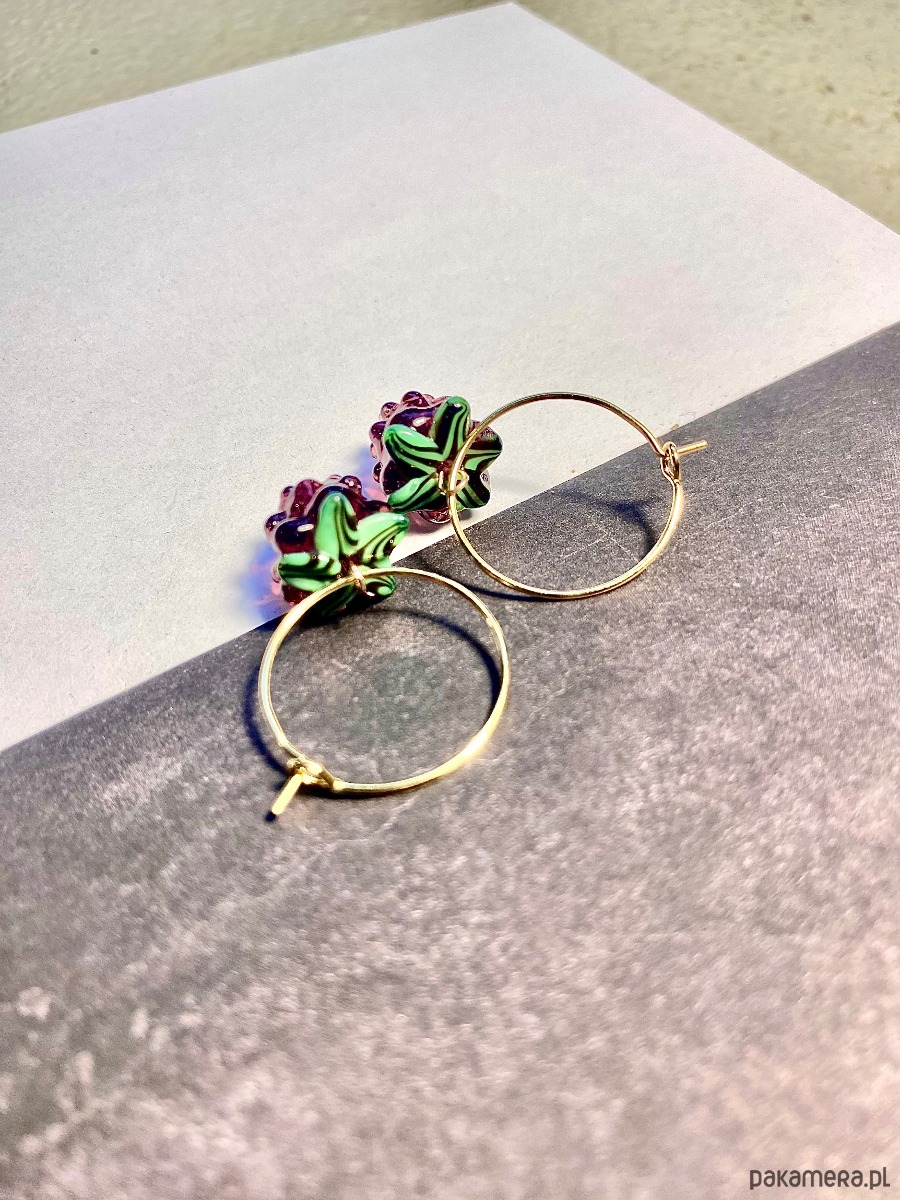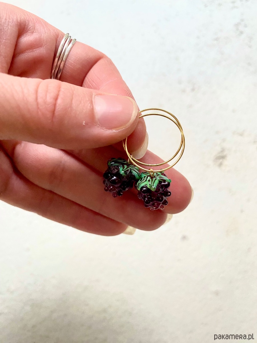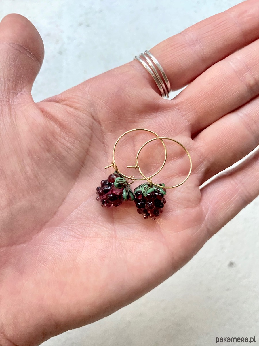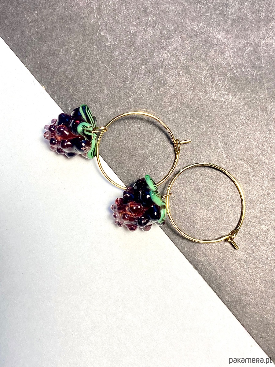 Szklane jerzyny w ciemno fioletowym kolorze pod światło mienia się w odcieniach brązu i pastelowego fioletu. Mocowane na złotych zapięciach ze stali nierdzewnej. Łatwe do zakładania i zdejmowania.
