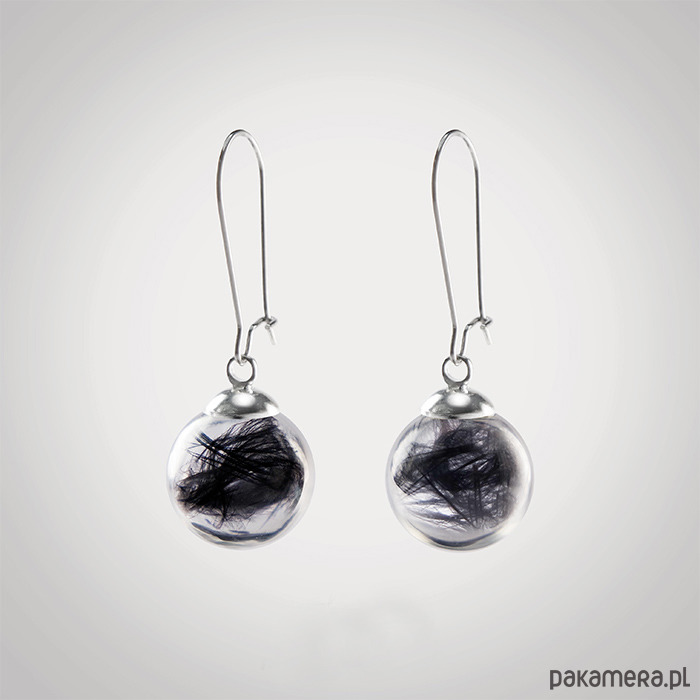 Delikatne czarne piórka umieszczone w szklanych bańkach o średnicy ok. 1,5 cm.