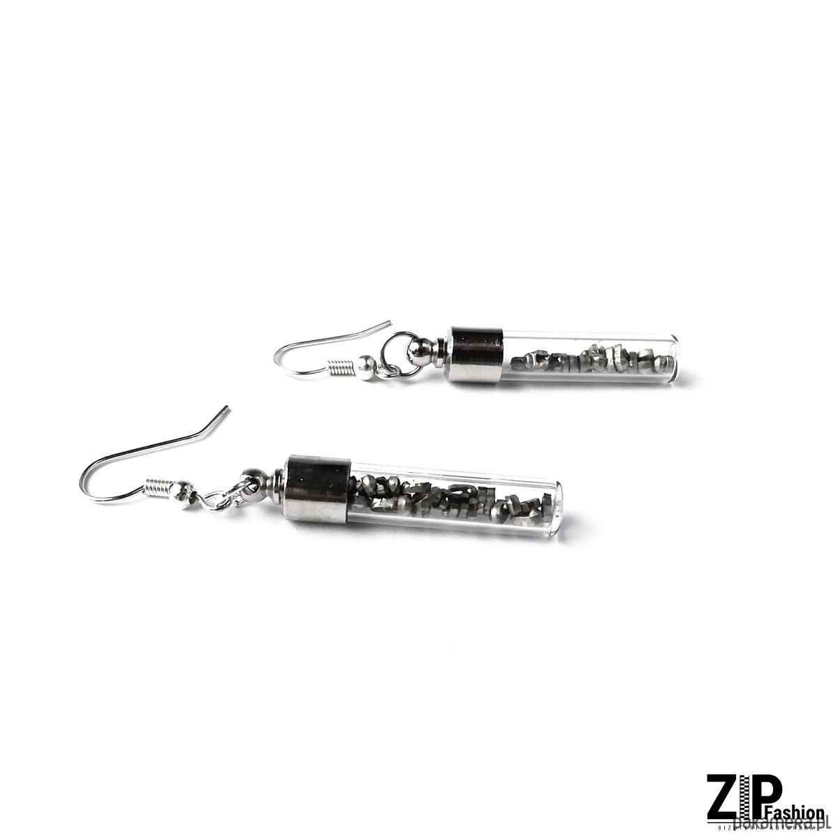 Kolczyki to zawieszone na antyalergicznych biglach szklane menzurki wypełnione Zipami.