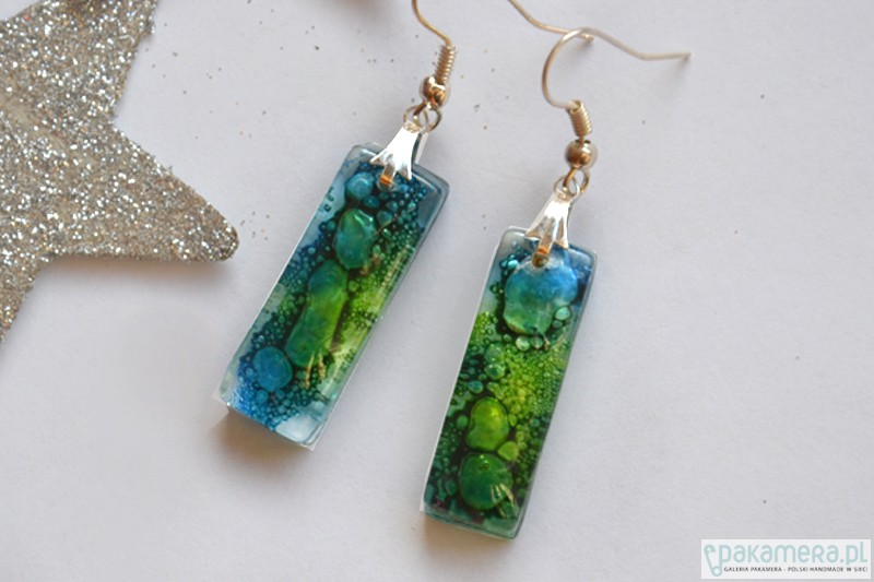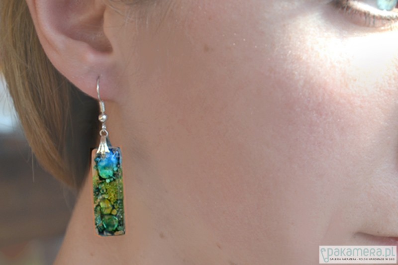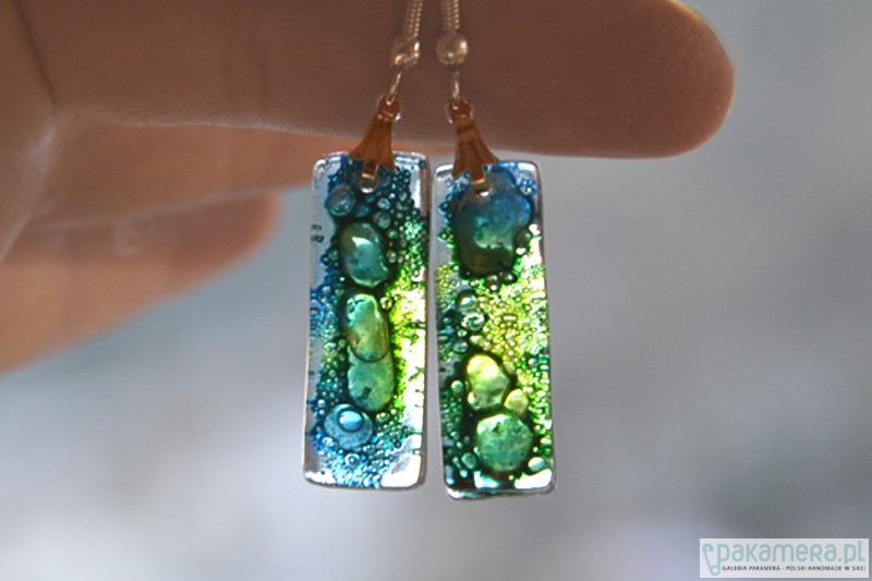 Szklane kolczyki z mnóstwem zielonych i ciemno niebieskich bąbelków w środku. Długość całego kolczyka ok. 5cm. Lekkie i efektowne! Biżuteria w 100% wykonana ręcznie, poszczególne sztuki mogą się nieznacznie różnić.