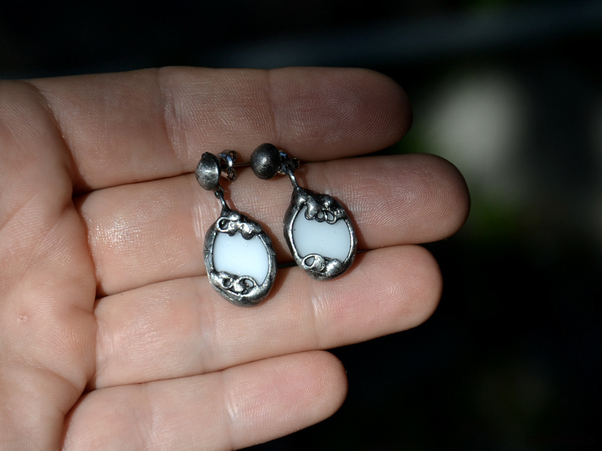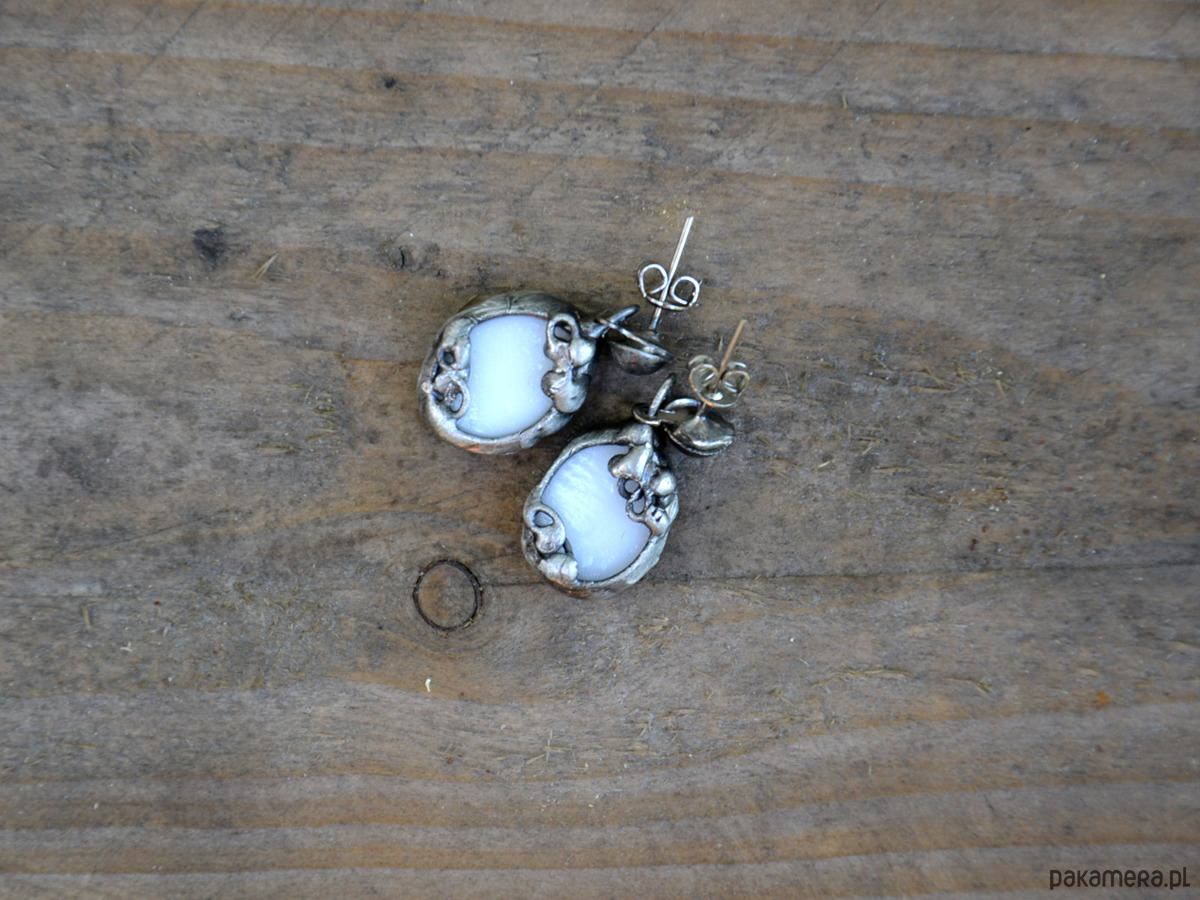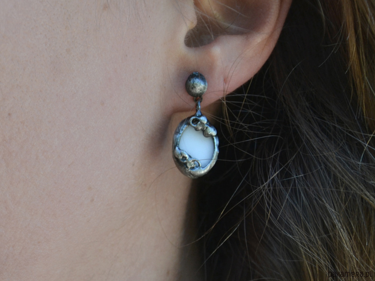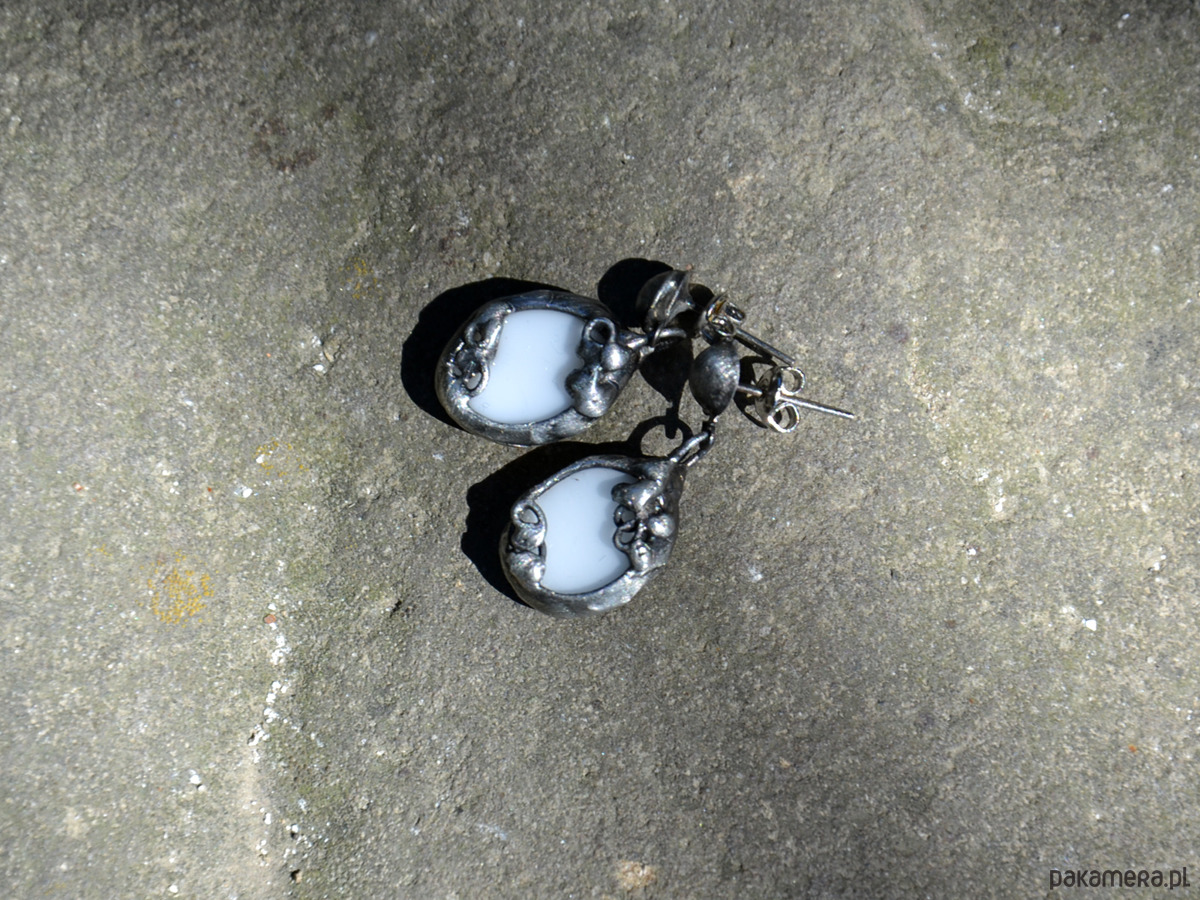 Delikatne, niewielkie, lekkie kolczyki z białym szkłem. Oprawa w kolorze starego srebra. Długość kolczyka to ok. 2 cm. Biżuteria w 100% wykonana ręcznie, poszczególne sztuki mogą się minimalnie różnić.