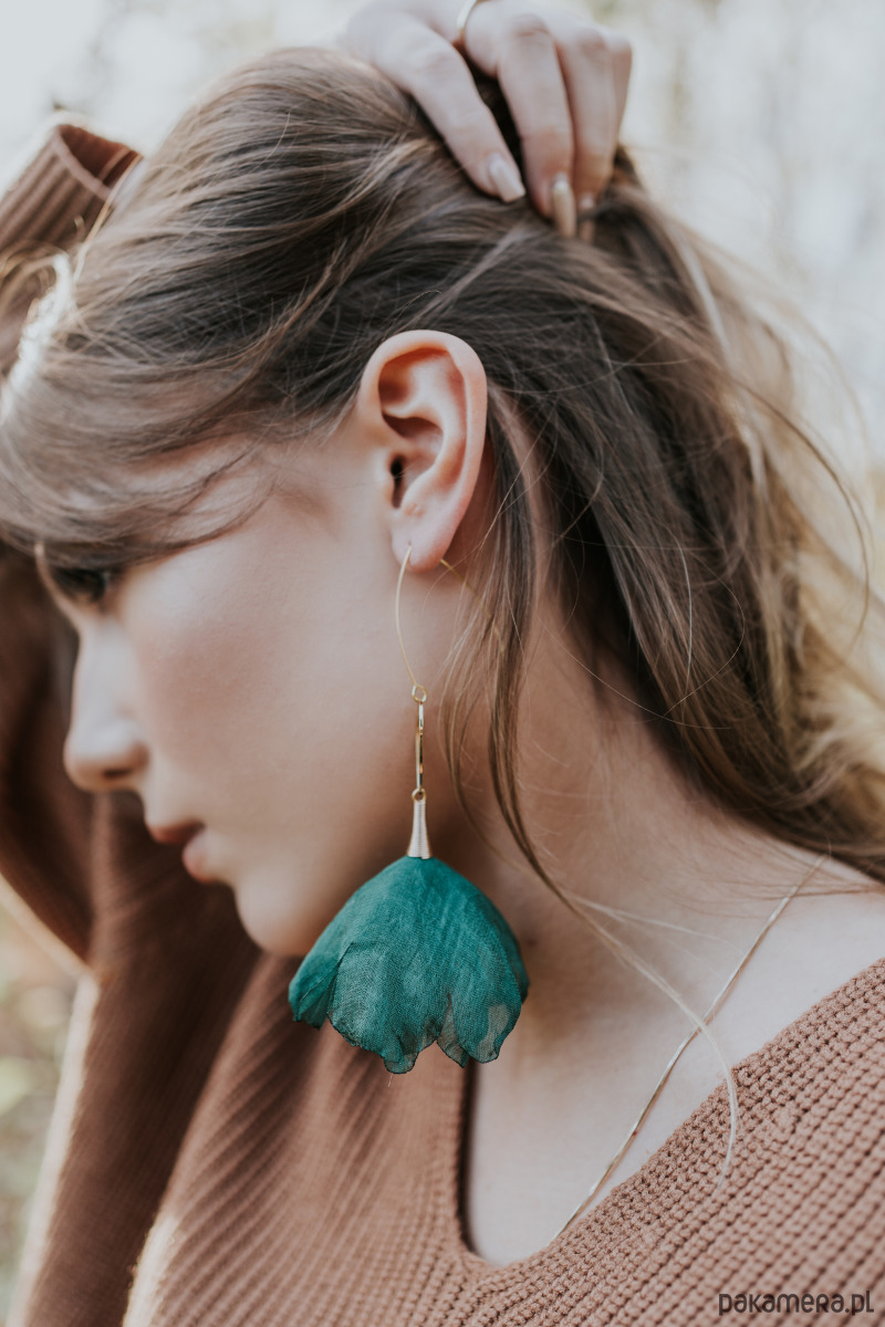 Modelka prezentuje kolczyki kwiaty długie peonie – Julia