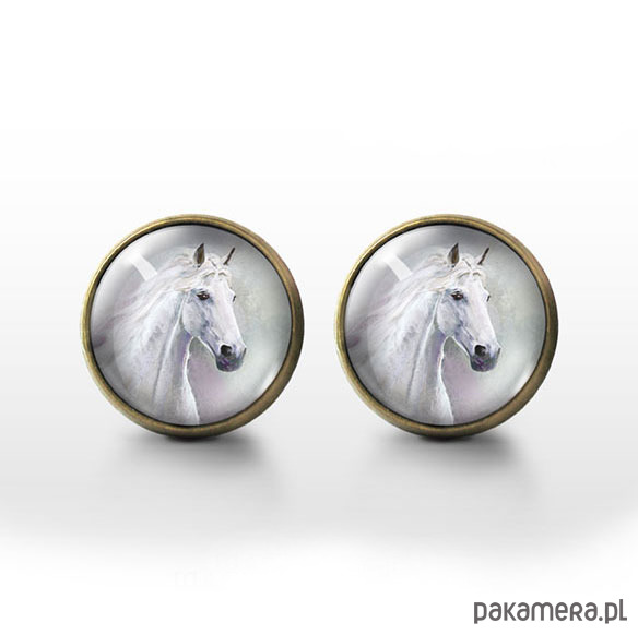 Kolczyki sztyfty - Biały koń - brąz