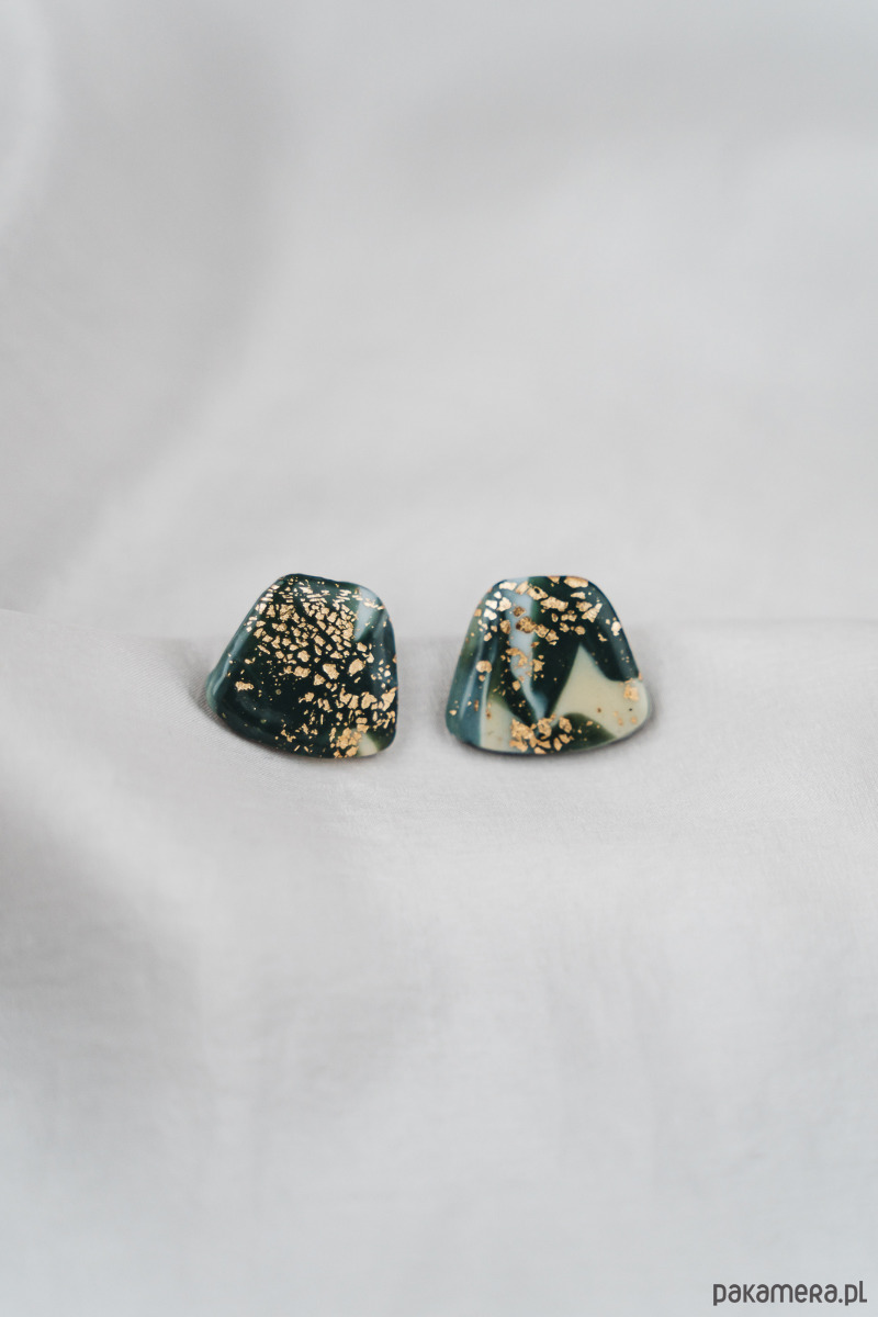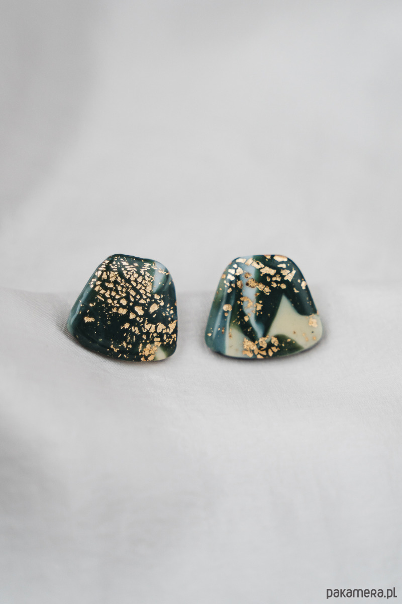 Wiszące kolczyki wykonane z gliny polimerowej i żywicy, na sztyfcie ze stali nierdzewnej.