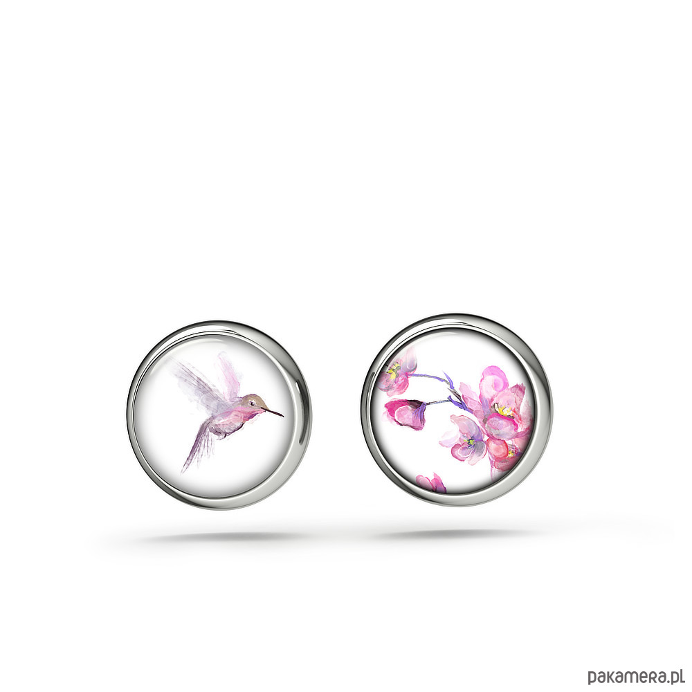 Grafika ukryta w delikatnych, malutkich kolczykach, pod osłoną przeźroczystego półokrągłego szkiełka.