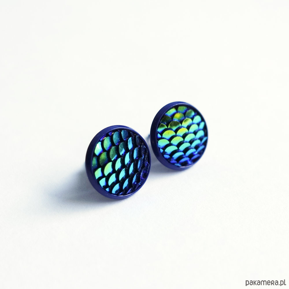 Niezwykłe, subtelne, małe kolczyki sztyfty z kaboszonem z żywicy imitującym łuski.