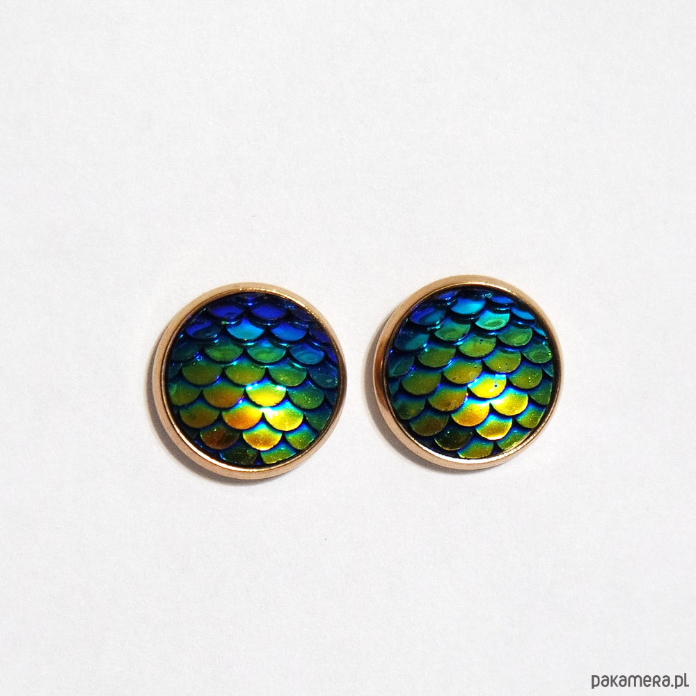 Niezwykłe, subtelne, małe kolczyki sztyfty z kaboszonem z żywicy imitującym łuski.