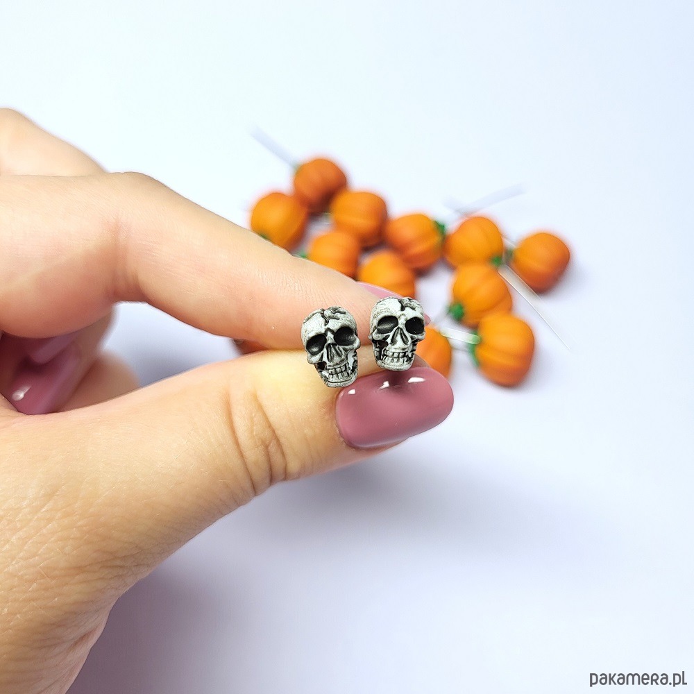 Kolczyki sztyfty z modeliny z motywem czaszek. Idealne na mroczną imprezę Halloween.